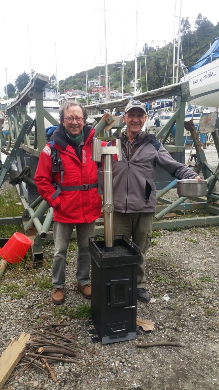 Le Capitaine de Parpar est descendu depuis Los Angeles en passant par l’île de Pâques. Il souhaite découvrir les canaux de Patagonie au moins jusqu’à Puerto Eden et il a donc fait l’acquisition d’un poêle à bois artisanal Chilien testé ce matin aux pieds de son bateau. Il se chauffera au bois flotté (drift wood)
