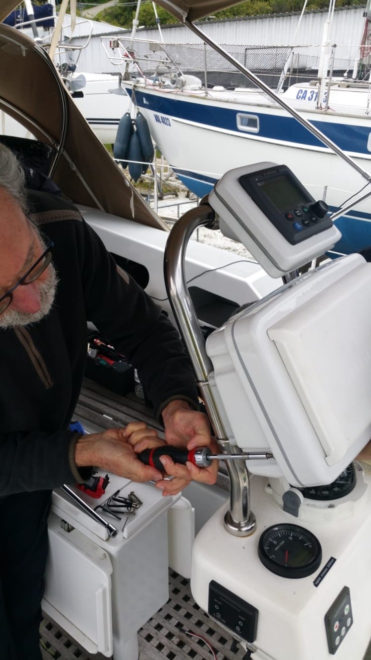 Dernière vérification avant de la reposer dans l’eau : après avoir purgé les bulles d’air avec la pompe d’amorçage, réveillé le moteur, en actionnant la clé de contact tout en l’empêchant de démarrer en agissant sur le levier stop, afin de faire monter la pression d’huile, puis démarrer et le faire tourner doucement pour chasser les dernières bulles. Une fois dans l’eau au pieds du quai, elle devra rester manoeuvrante. Le moteur sera démarré au ralenti en maintenant le bateau jusqu’à obtenir un ronronnement régulier de Volvo en bonne santé