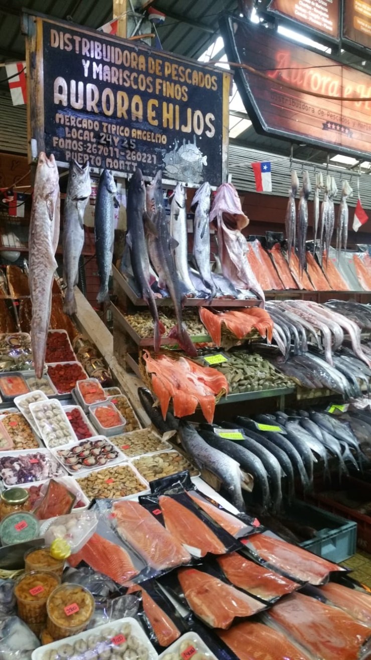 Nous avons acheté du saumon frais et un autre fumé. Au programme cette semaine : un congre Chilien (le poisson rose à gauche du panneau)