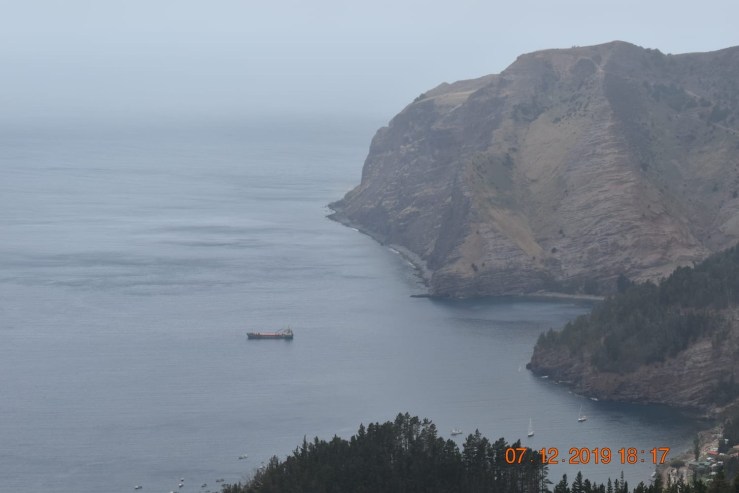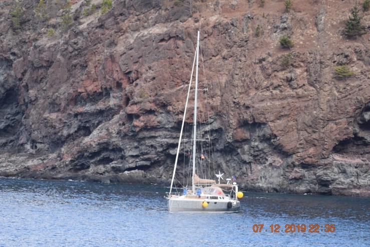 Île de Robinson. Photo prise depuis les ruines de la cabane de Robinson. La Laureline est au mouillage en bas à droite.
