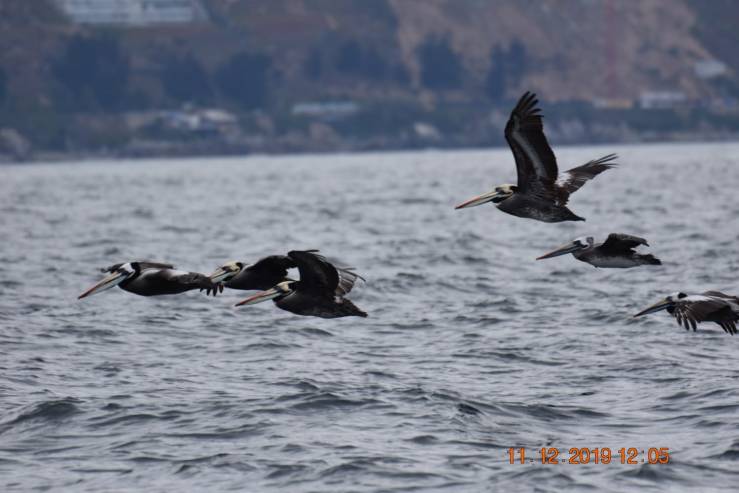 Valparaiso. Escadrille de pélicans du Pérou à pattes bleues