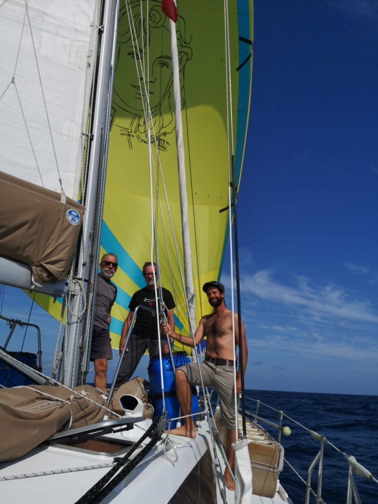Au final, 55 m de longeur ont été récupérées, et la drisse remise en place, le bout réparé côté piano, prête à repartir avec une voile fixée sur la poulie de moufflage en tête de mât. Après une deuxième nuit de récupération, l’ancre a été levée, silence radio de part et d’autre, et le mouillage quitté voile haute aux premières heures du jour.