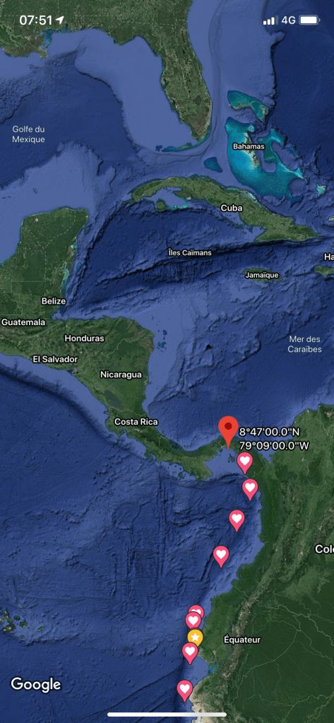 Ancre levée devant La Esmeraldas à l’heure du thé, coucher de soleil sur l’île Comote au sud est de la grande île Del Rey dans l’archipel des Perlas, puis nuit passée à tirer des bords dans un espace un peu étroit, entre la côte Est de Del Rey et l’isthme de Panama, par un vent constant oscillant entre 15 et 25 noeuds et un axe Nord à Nord Nord Ouest.