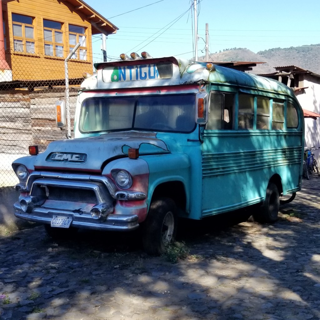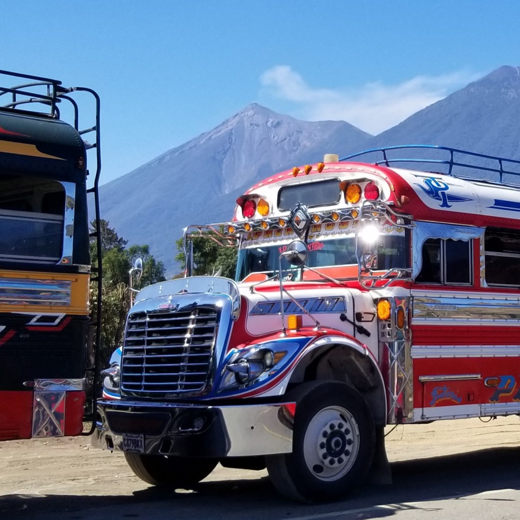 En reprenant la route vers le Pacifique, nous passons près du parking des camionettas . Ces merveilles ont vécu une première vie aux USA et ont été recyclées ici pour le transport des gens qui les utilisent pour aller au marché et en revenir avec des poulets , d’où leur surnom de « chiken bus » . Ils ont été magnifiquement restaurés, et même si les moteurs fument un peu dans les montées, ils tournent toujours, les chromes sont astiqués avec amour et leurs couleurs sont pimpantes.
