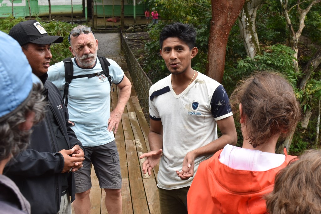 Il se gare près d’un hôtel en construction, suspendu au bord du torrent et nous sommes accueillis par un jeune homme qui nous explique en q’qechi, un dialecte maya, ce qu’est ce village et ce que cherchent à développer ses habitants. Le guide de Authentic Guatemala traduit en espagnol.