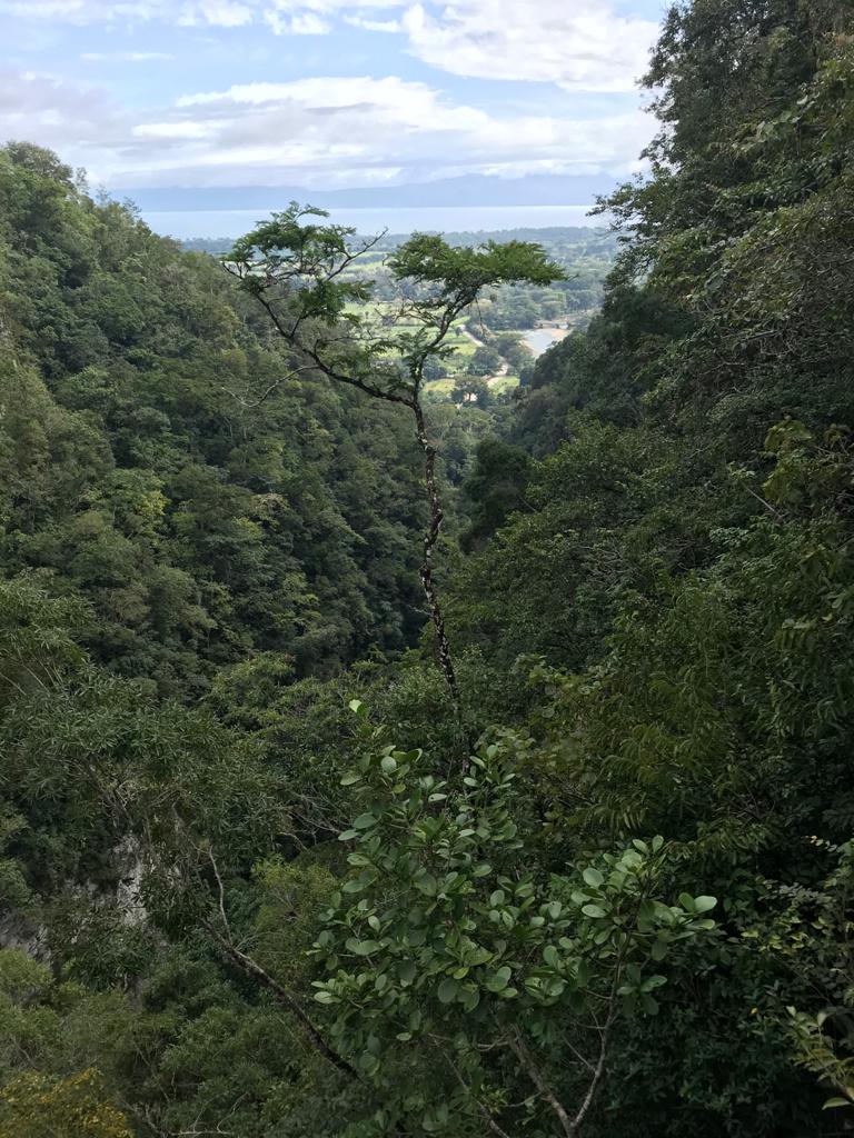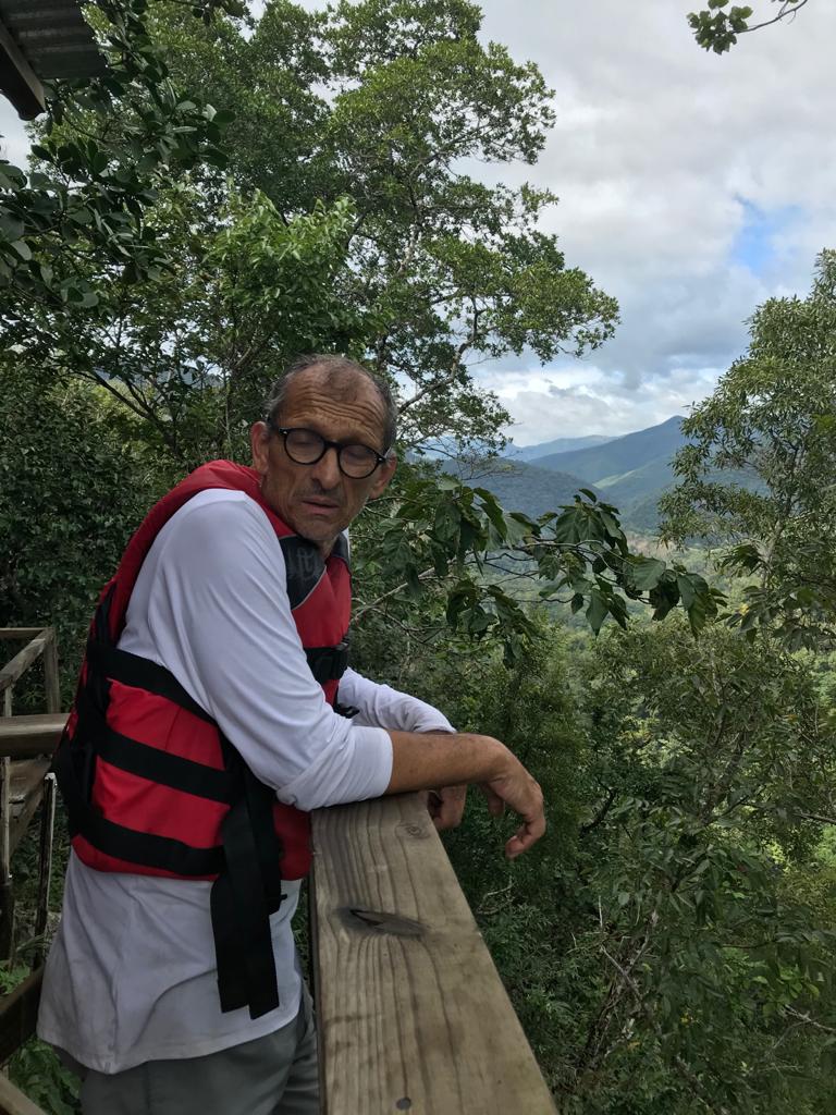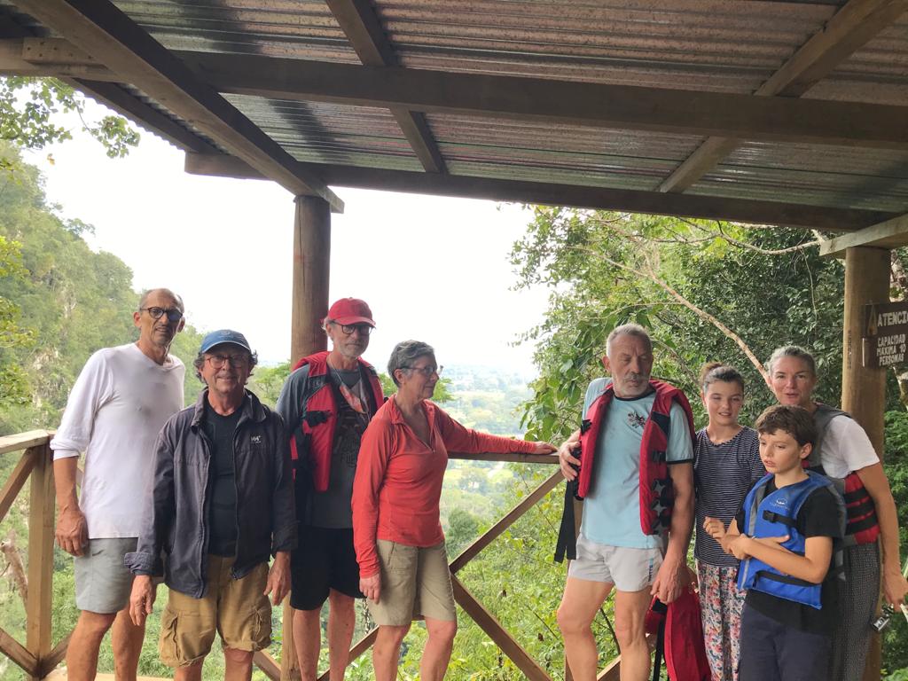 Un jeune maya souriant montre le chemin. Des marches ont été cimentées , ou pas, et alors la glaise est bien glissante et le précipice guette. Une passerelle en bois accrochée à la paroie rocheuse est constellée de crottes de singes qui viennent ici pour les fruits zapotas qu’ils affectionnent. Le jeune guide explique que c’est aussi un bel endroit pour mourir. Les vieux singes viennent là pour leur dernière contemplation du torrent qui gronde en bas.