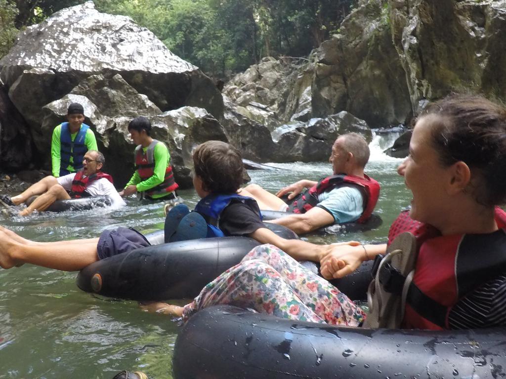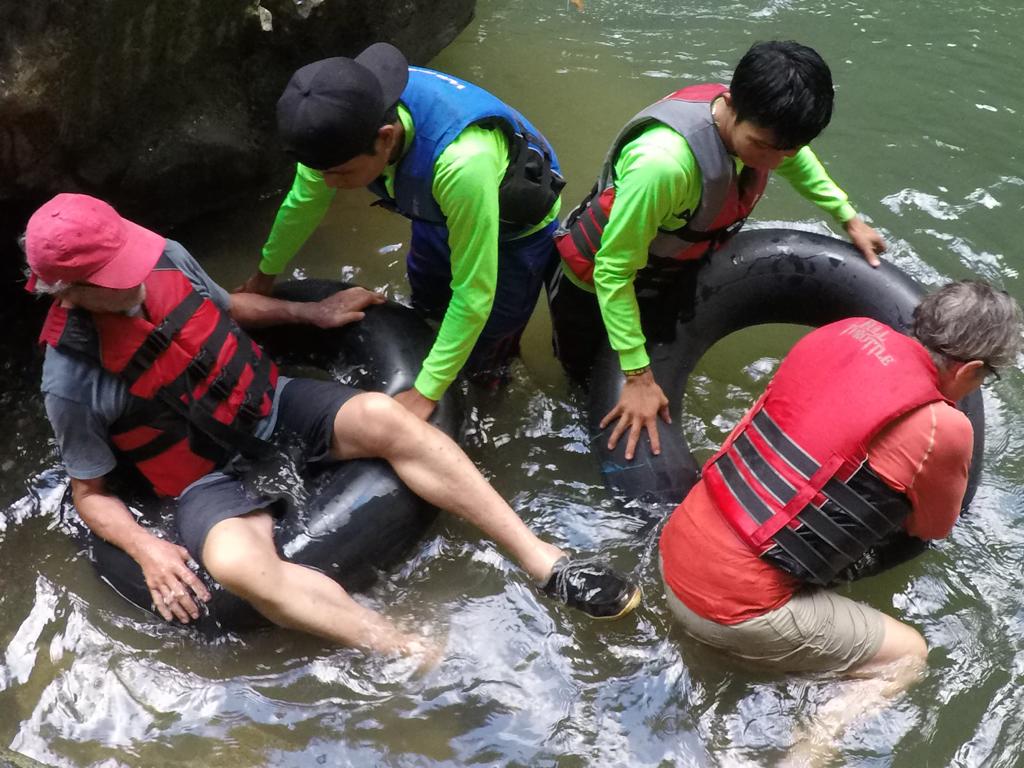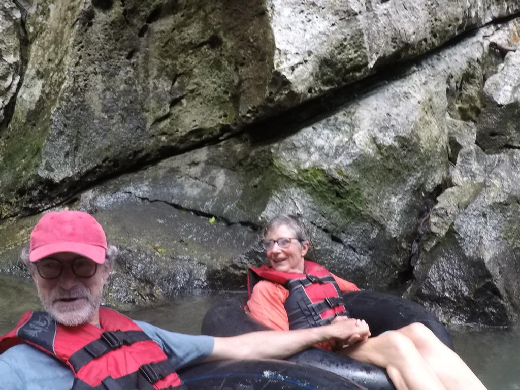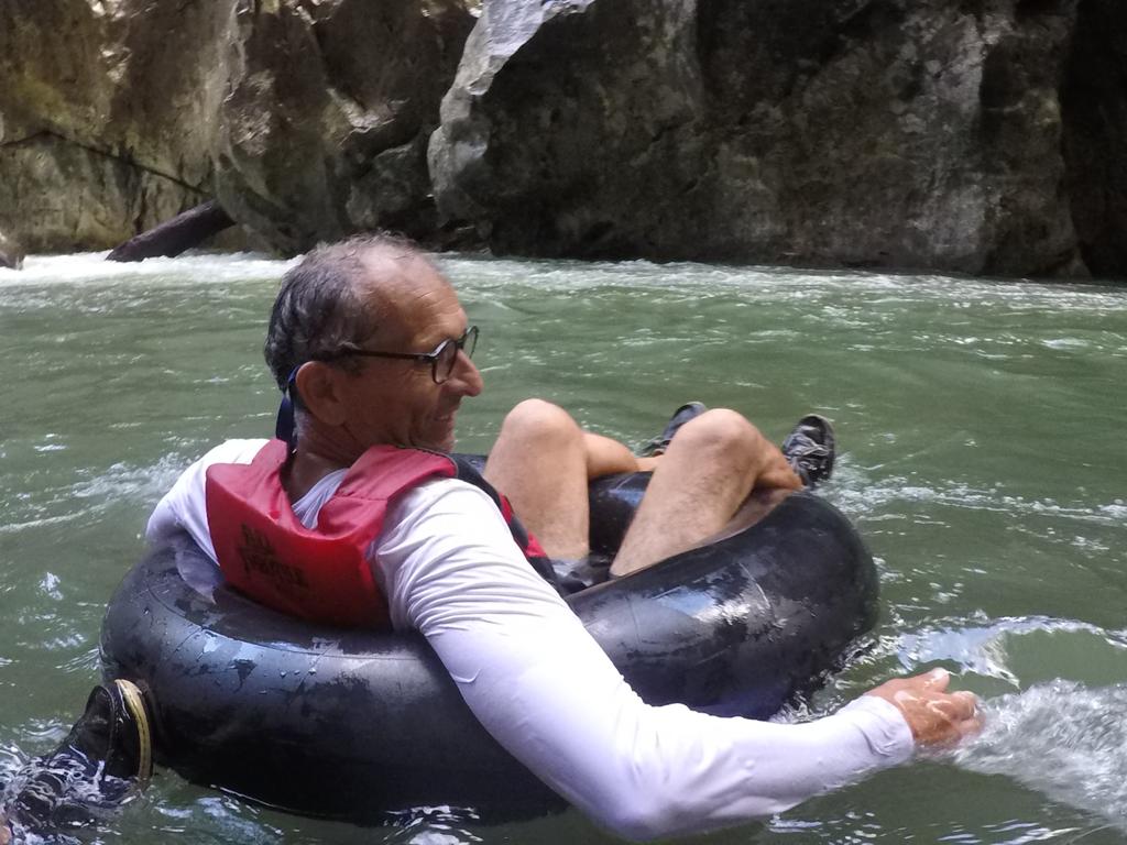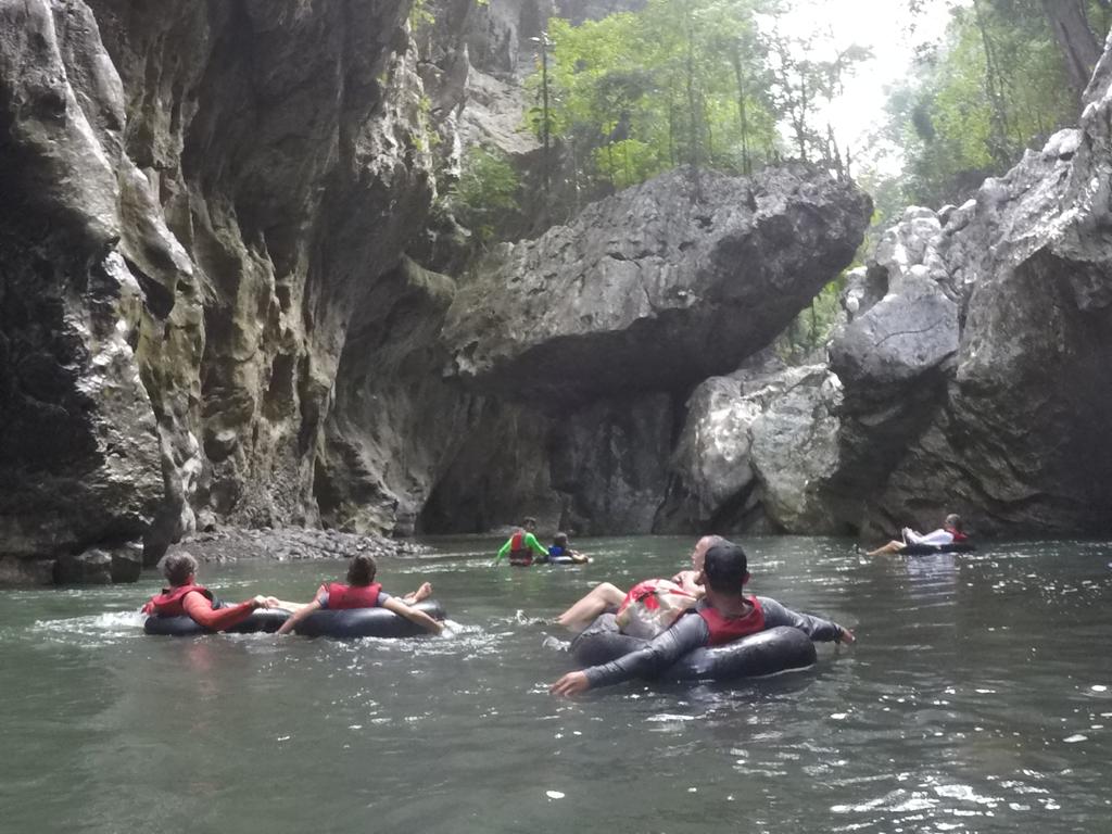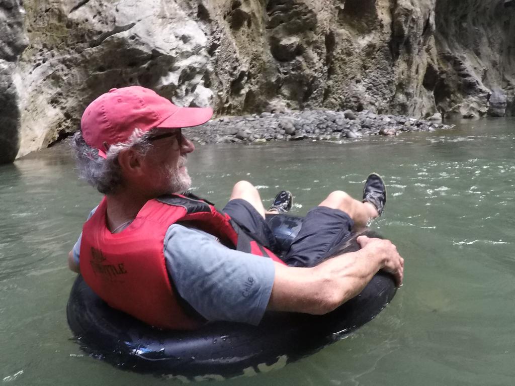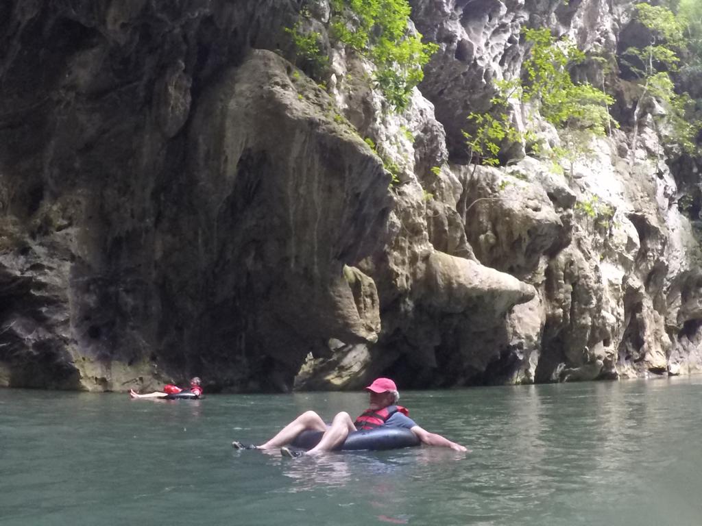Nous redescendons vers un embranchement ou avaient été déposés nos chambres à air, et de descendre un raidillon pour accéder au fleuve. Deux jeunes mayas accompagnent l’installation des gringos tout habillés, chacun dans son pneu sur l’eau verte, et de là , c’est le courant rapide entre deux paroies fabuleuses, hautes comme les flancs d’une cathédrale , lissées par des millénaires de crues.