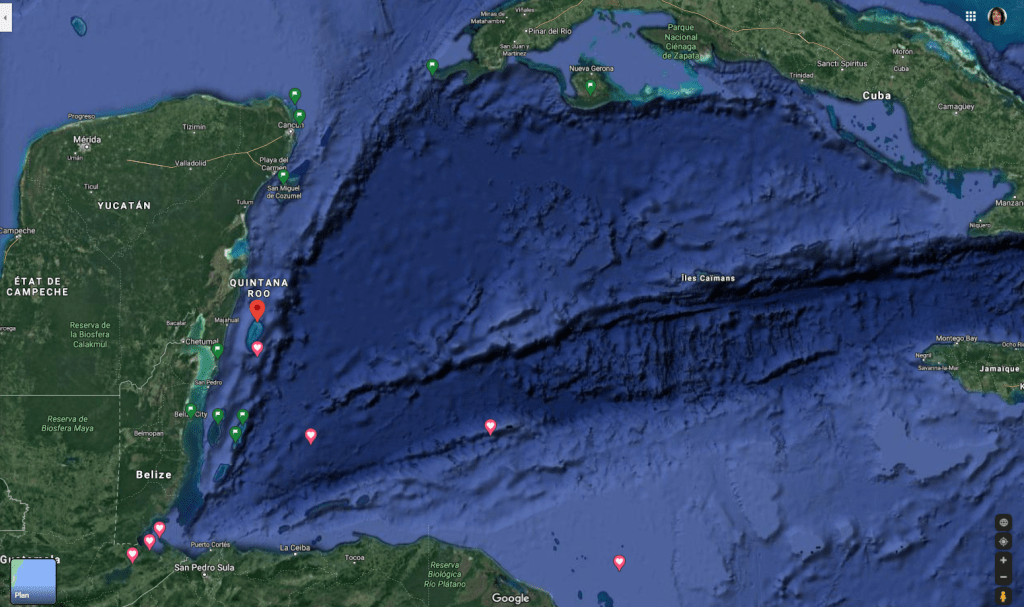 Adieu le Belize, traverse du sud au nord en 4 jours a travers les patates de corail. Hier belle navigation musclee jusque Cayo Norte au Mexique par vent de SE 20 kt, rafales 25, grosse houle au debut puis mer plus plate derriere Chinchorro bank, sous GV haute et gennacker. C’est l’allure preferree du bateau qui a cavalle assez vite presque toute la journée au dessus des 10 Kt.