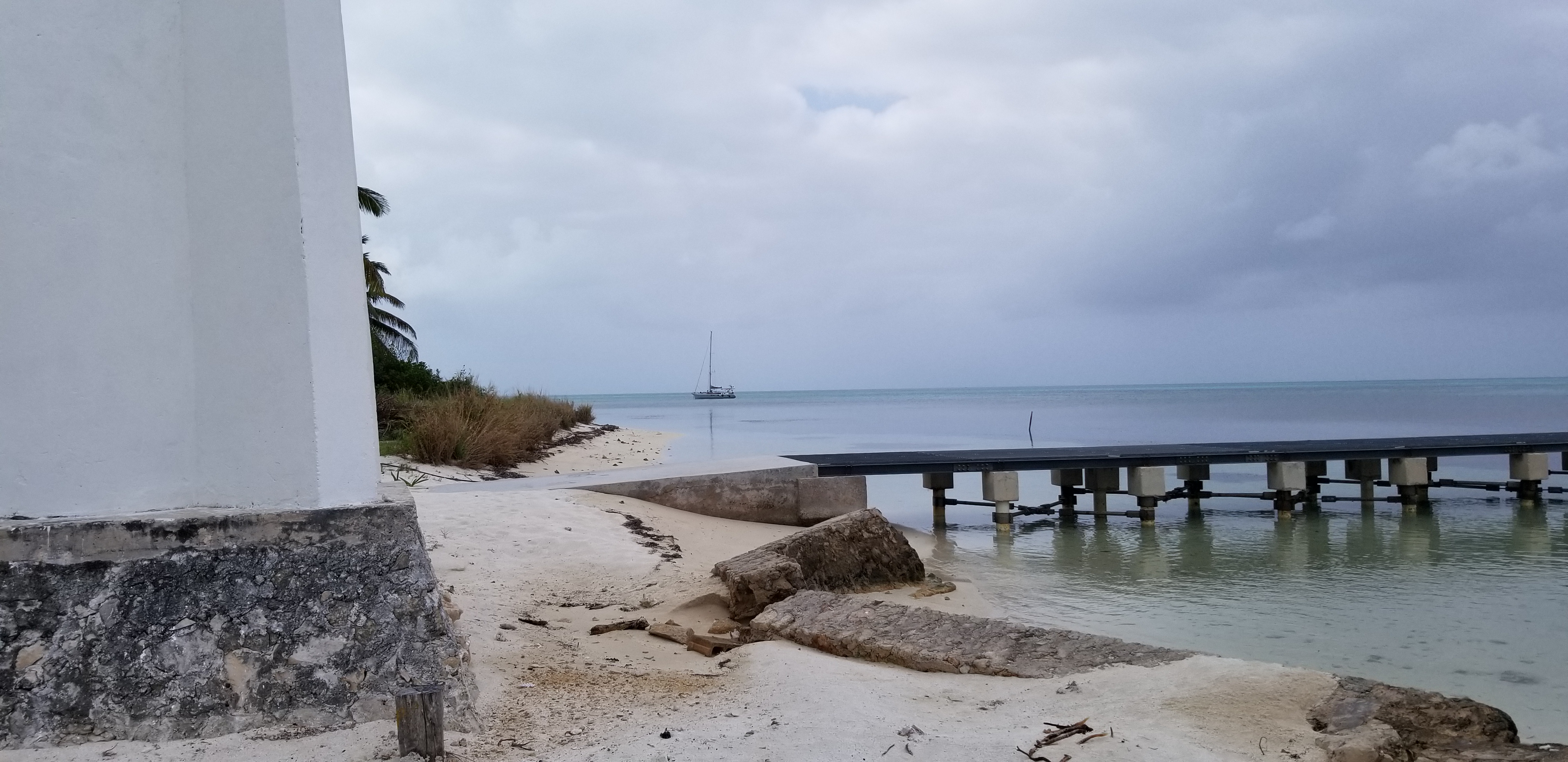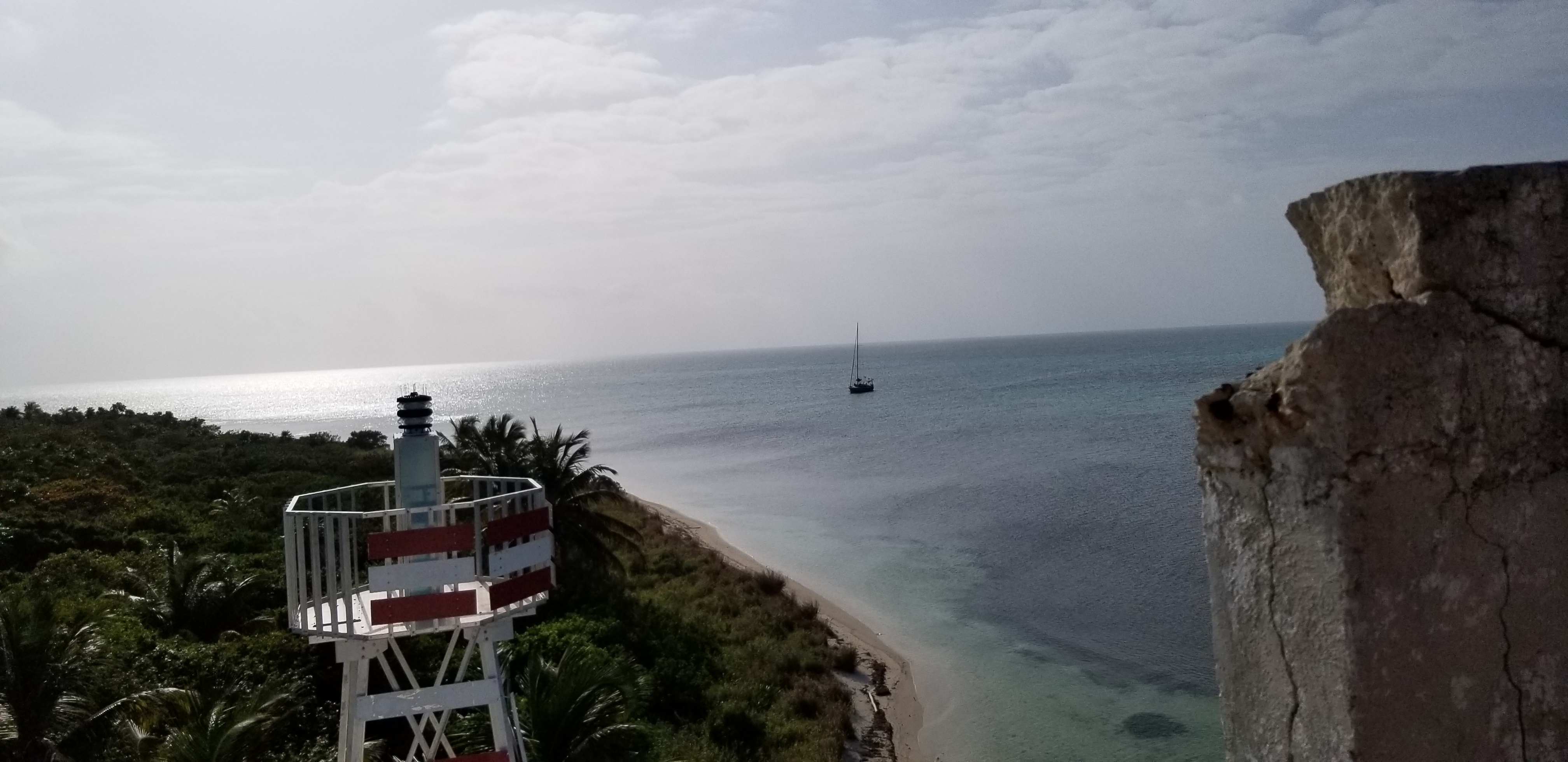 Sous grand voile et genacker par vent de travers, aidée par un courant portant de 1 puis 2 nœuds, la Laureline a battu ses records de vitesse malgré son poids. Vers 16 heures, elle entrait dans la passe nord de l’atoll corallien de Chinchorro bank, pour aller jeter l’ancre dans du sable devant le phare blanc de Cayo Norte.
