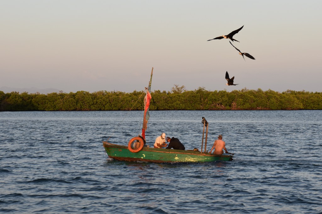 Sternes et mouettesoiseau raremouettes à tête noireéchange de vues entre sterne et mouetteloin des côtes avec rame et voile aurique de fortunefrégates toujours friandes de la pêche des autres, Marea del Portillodépart pour la pêche, Chiviricopêcheur à pied, ChiviricoBarque qui potte potte potteSantiago de Cuba, le ferryPêcheurs sur des pneus de camion, sans barque ni canne à pêche, au milieu du chenalles 3 mousquetaires à Cuba