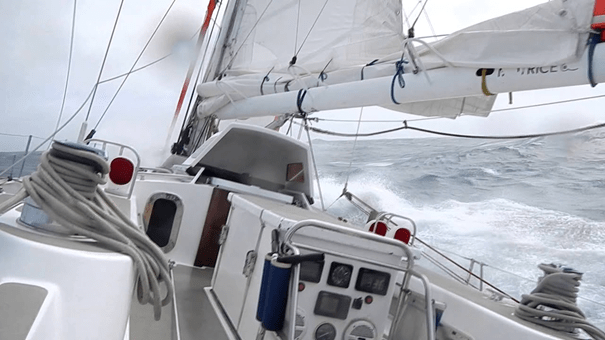 Rouler un peu plus ou un peu moins le yankee c’est très facile. Mais presque tout rouler et avancer avec un petit bout ce n’est pas aussi efficace sur le long terme qu’une voile faite pour les vent forts. La ils savent que le beau temps va revenir, ils ne vont pas changer la voile. Si jamais ils reçoivent l’info que le vent va rester fort pendant longtemps ils replieront complétement le yankee et sortiront la voile « Trinquette » de son sac. Mais pour maintenant et la semaine à venir, le vent va rester facile là ou ils sont.