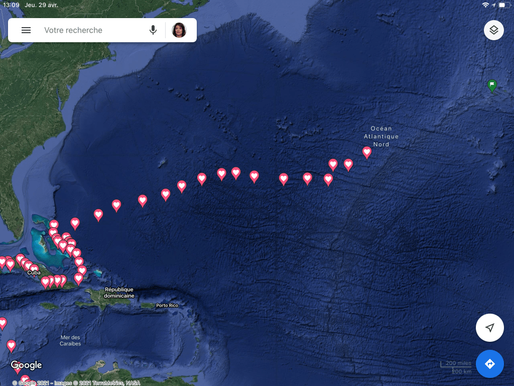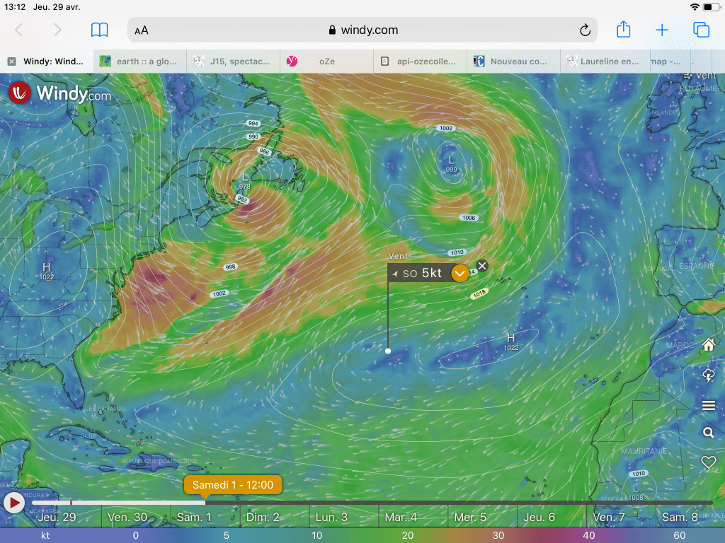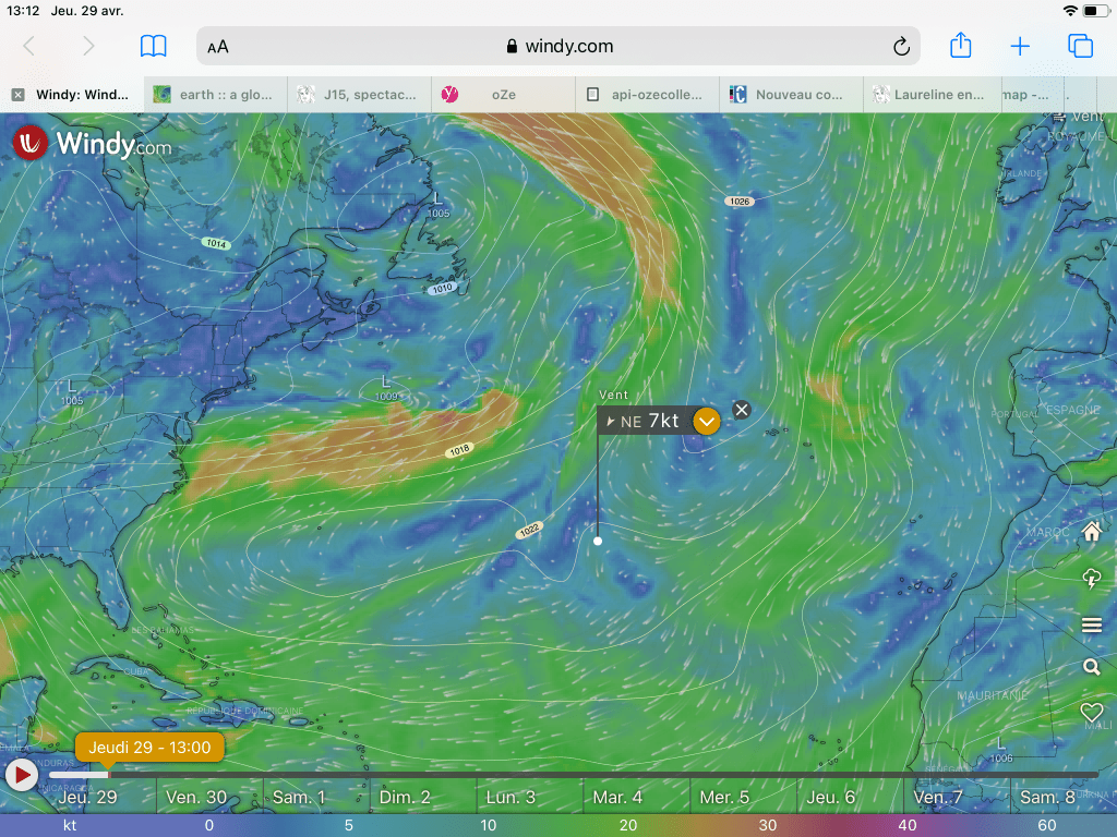 L anticyclone au large de la Floride hier les a rattrapés, ce qui explique le calme du vent. On voit s installer déjà aujourd’hui un coup de vent au large de New York, une tempête se prépare pour samedi. Heureusement leur anticyclone va rester sur les acores et les protéger du coup de vent général sur l atlantique