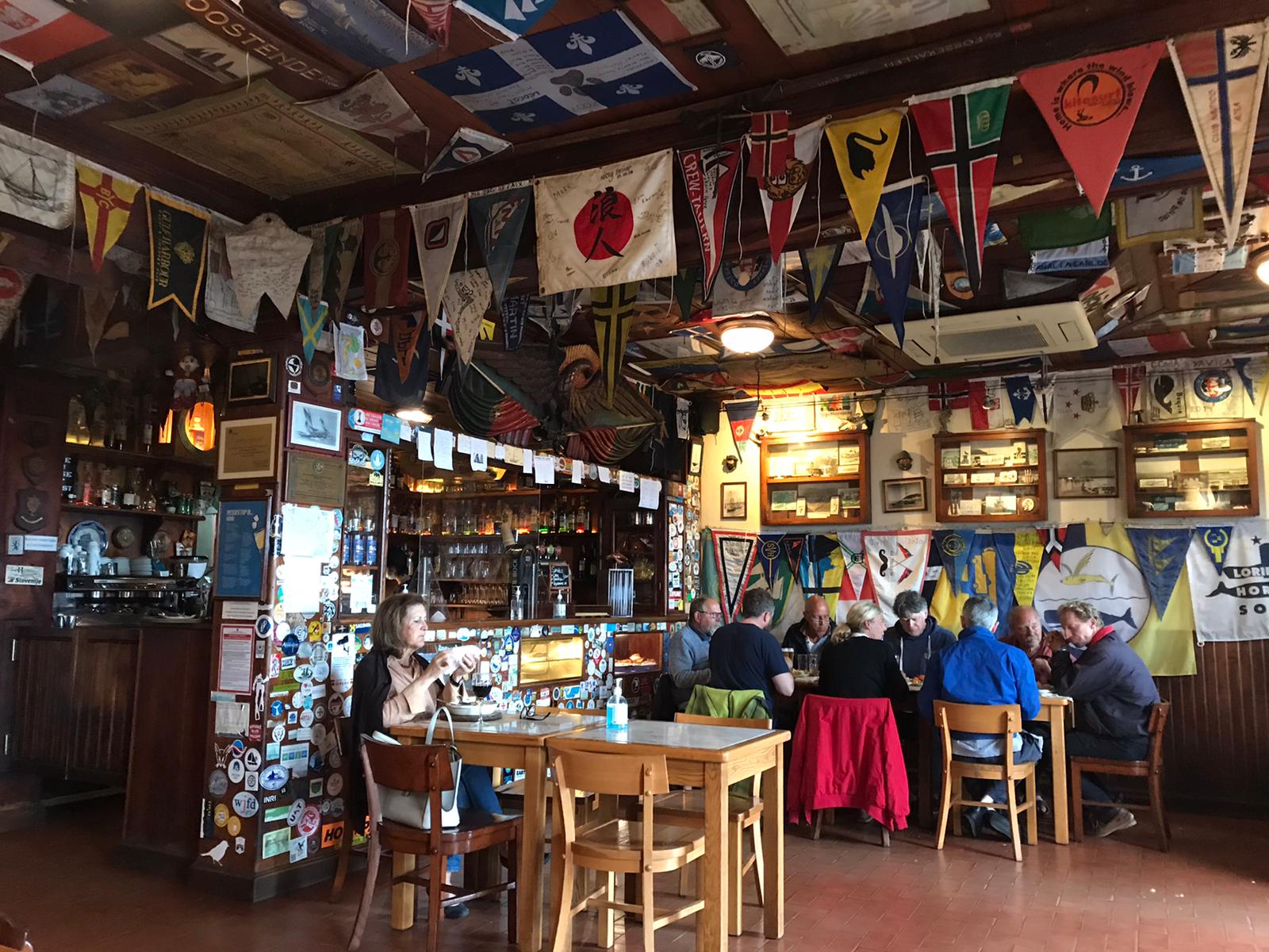 Le Café des Sports est un site incontournable de Horta. Décoré de fanions, drapeaux, petits objets accumulés depuis son ouverture en 1918, il offre un accueil chaleureux pour boire et manger, même s’il a du supprimer la moitié de ses tables. Au premier étage, un remarquable musée de Scrimshaw, l’art de graver des dents de cachalots, activité d’origine du fondateur de l’établissement. On peut toujours en acheter, elles sont gravées à partir d’un stock accumulé du temps ou la chasse au cachalot était la principale source de revenus des Acores