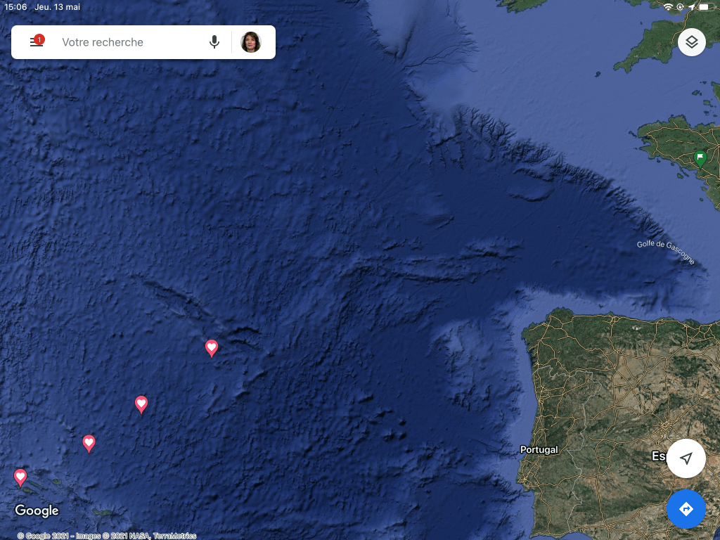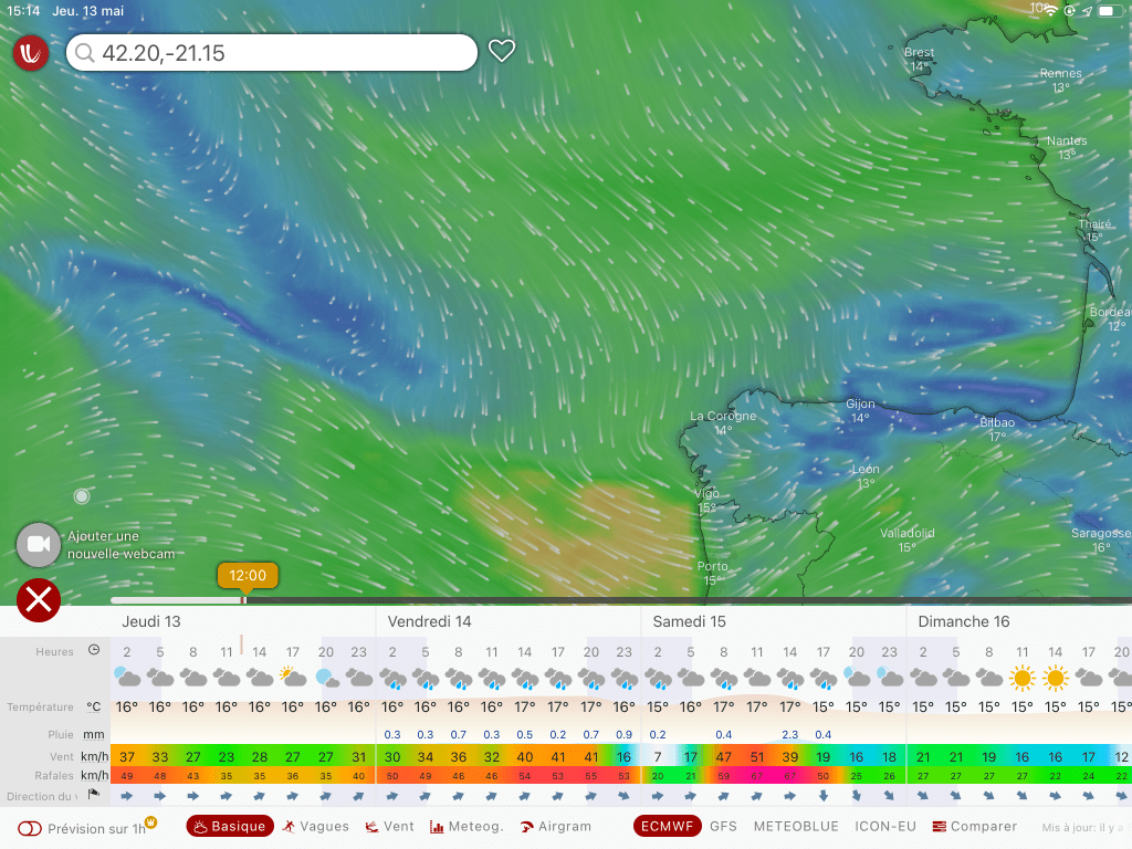 Position à 10:00 hTU le 13 mai : 42°20.40’N 21°15.12’W