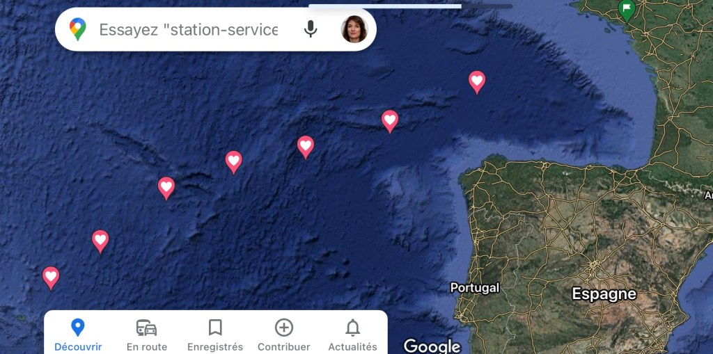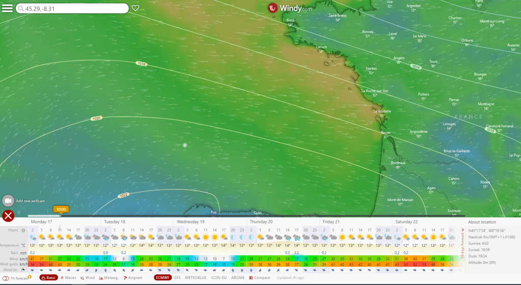 La civadière, les bonnettes, le grand cacatois, le grand perroquet, on envoie de la toile pour arriver avant la depresssion qui arrive des Açores, qui semble plus rude encore. Il y a bien La Corogne comme solution de repli, mais il semble que ce ne soit pas nécessaire, Nous avons de la chance ! ETA mercredi matin avec la marée haute pour passer l’écluse.