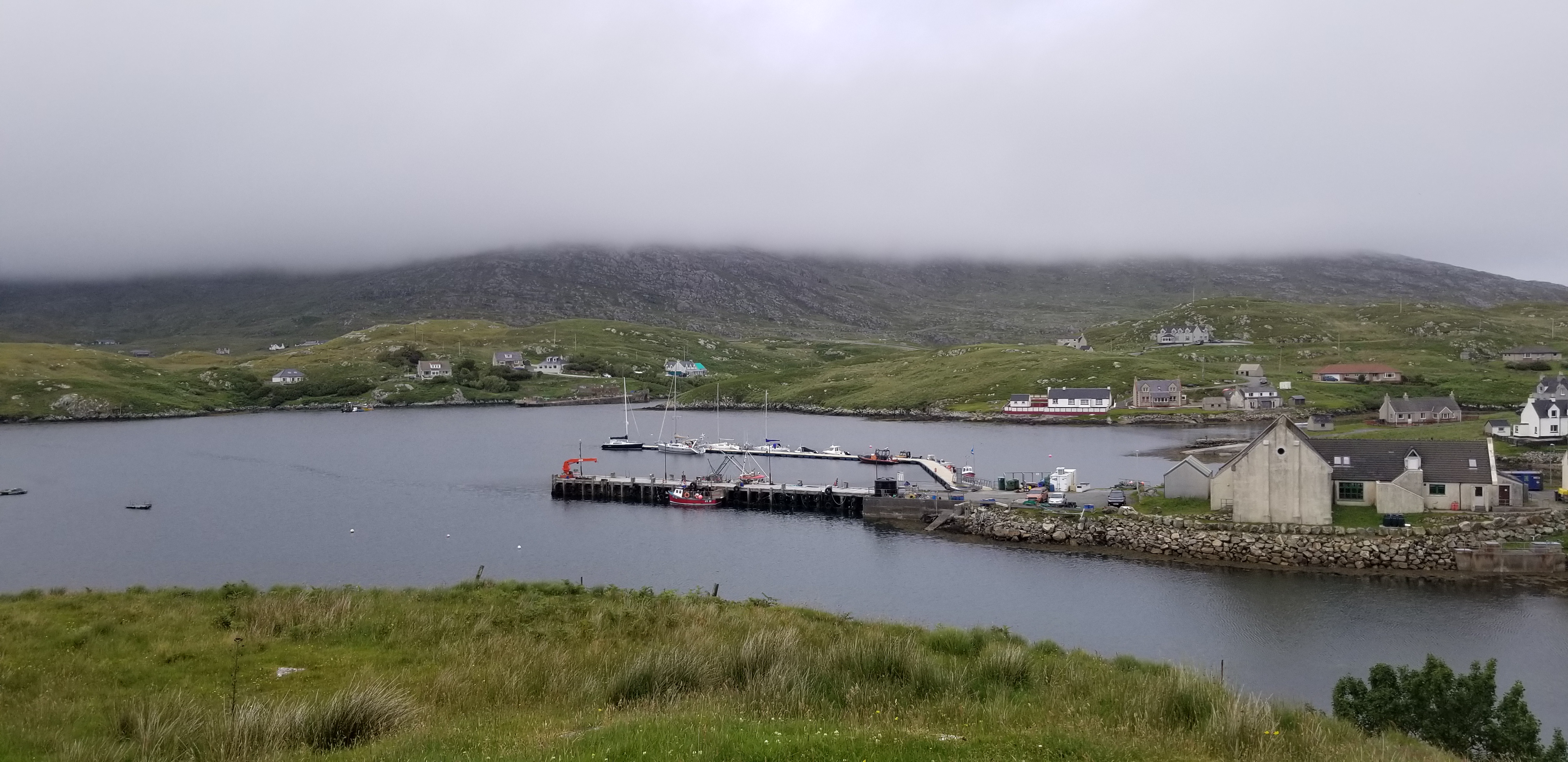 Arrivée à marée basse pour bien repérer les dangers. Le paysage est grandiose sous le brouillard qui tente de s’élever un peu. Des pâturage à moutons , des bateaux de pêche et probablement une petite ferme marine. L’île est peuplée , mais par ce dimanche maussade les rues restent désertes , hormis quelques moutons en goguette au bord des chemins.