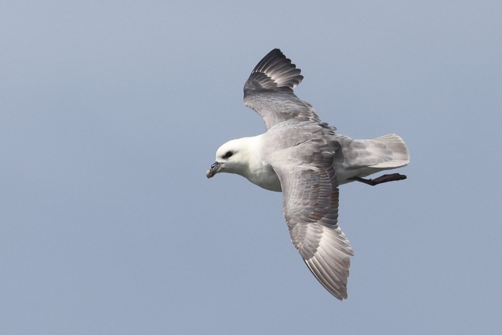 Il y a quantité d’oiseaux en mer. Cette accalmie météorologique est sans doute la bonne occasion pour les mamans guillemots d’emmener leurs petits à la pêche. Mais ils ne savent pas encore s’envoler de l’eau, et parfois les oiseaux sont surpris par l’arrivée du bateau sous voile : maman crie une espèce de « ouin » nasal et roulé, poussin répond par de petits cris et rapplique dare dare.