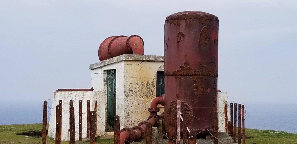 Proche d’un phare bas sur pattes, une grande corne de brume désormais en ruines