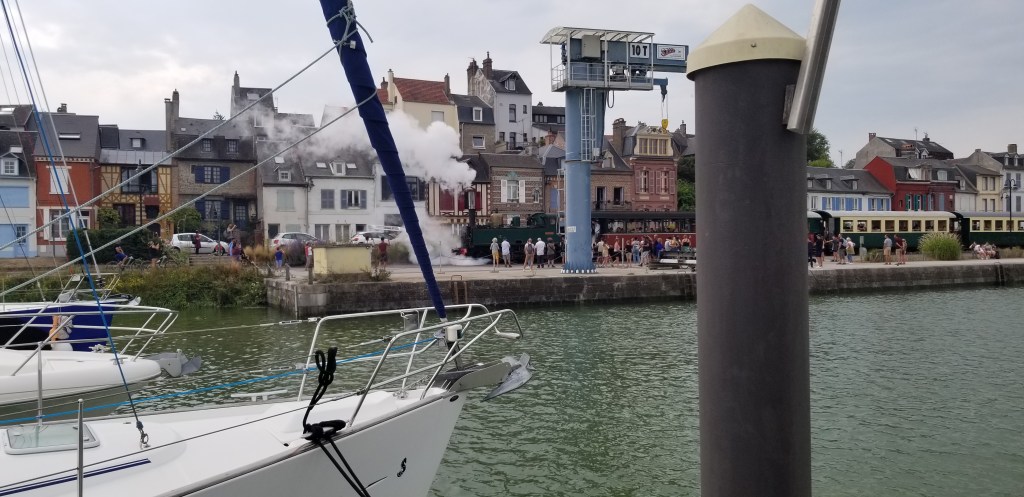 Tout avait bien commencé, départ de Boulogne à 6 heures du matin en ce 15 août, bien avant le lever du soleil, direction sud quasiment face au vent , voile et moteur donc jusqu’à l’embouchure de la Somme, pour embouquer le chenal qui mène à Saint Valery sur Somme 3 heures avant la pleine mer, conformément aux indications du bloc matine. En passant un appel à la marina, il nous est alors donné pour instruction de repartir à la bouée d’entrée et de s’y ancrer pour attendre le moment propice, soit 2 heures avant la marée de St Valéry. Demi tour donc le moteur est poussé pour lutter contre le courant… et s’essouffle piteusement, pour s’arrêter tout à fait sitôt l’ancre posée par 20 nœuds de vent, creux de 1 m50.