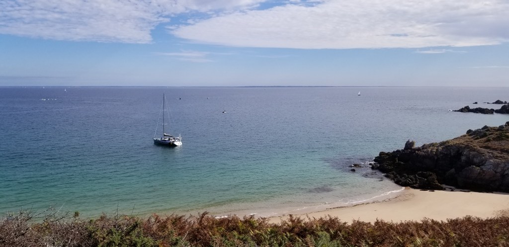 Matinnée insouciante à Houat, au mouillage sauvage de Portz Ler, juste après avoir franchi le passage du Beniguet. Enfin une possibilité de baignade, l’ensoleillement s’y prête. C’est après que ça se complique.