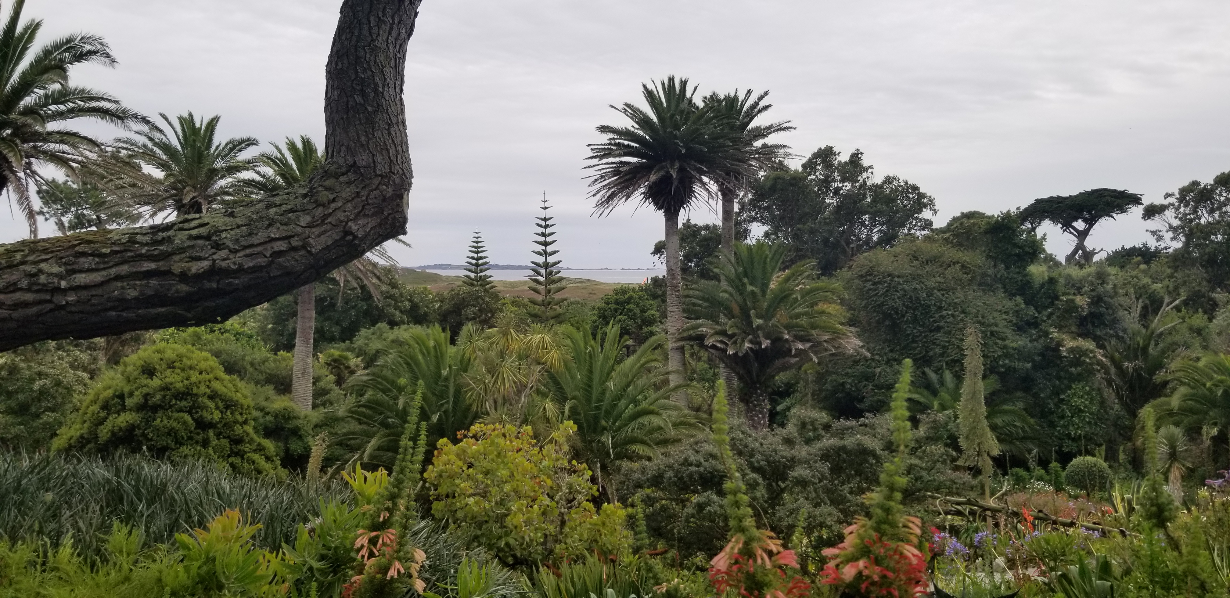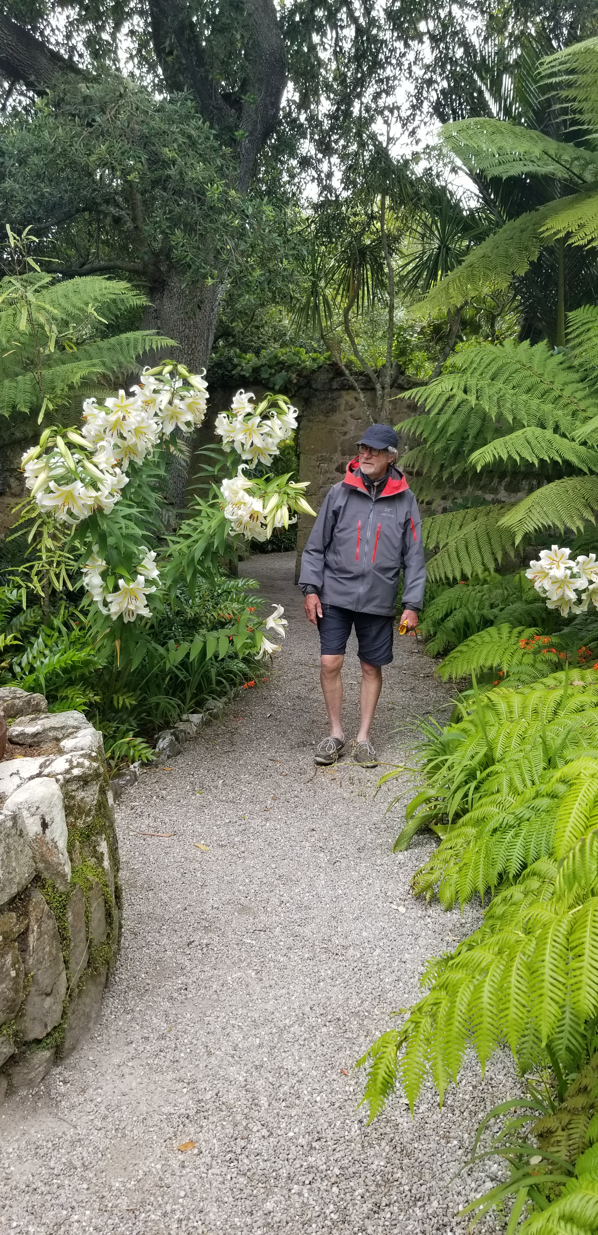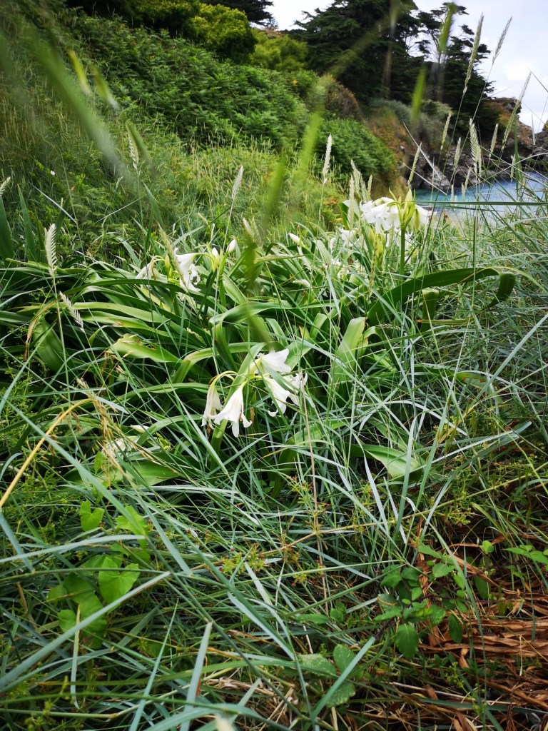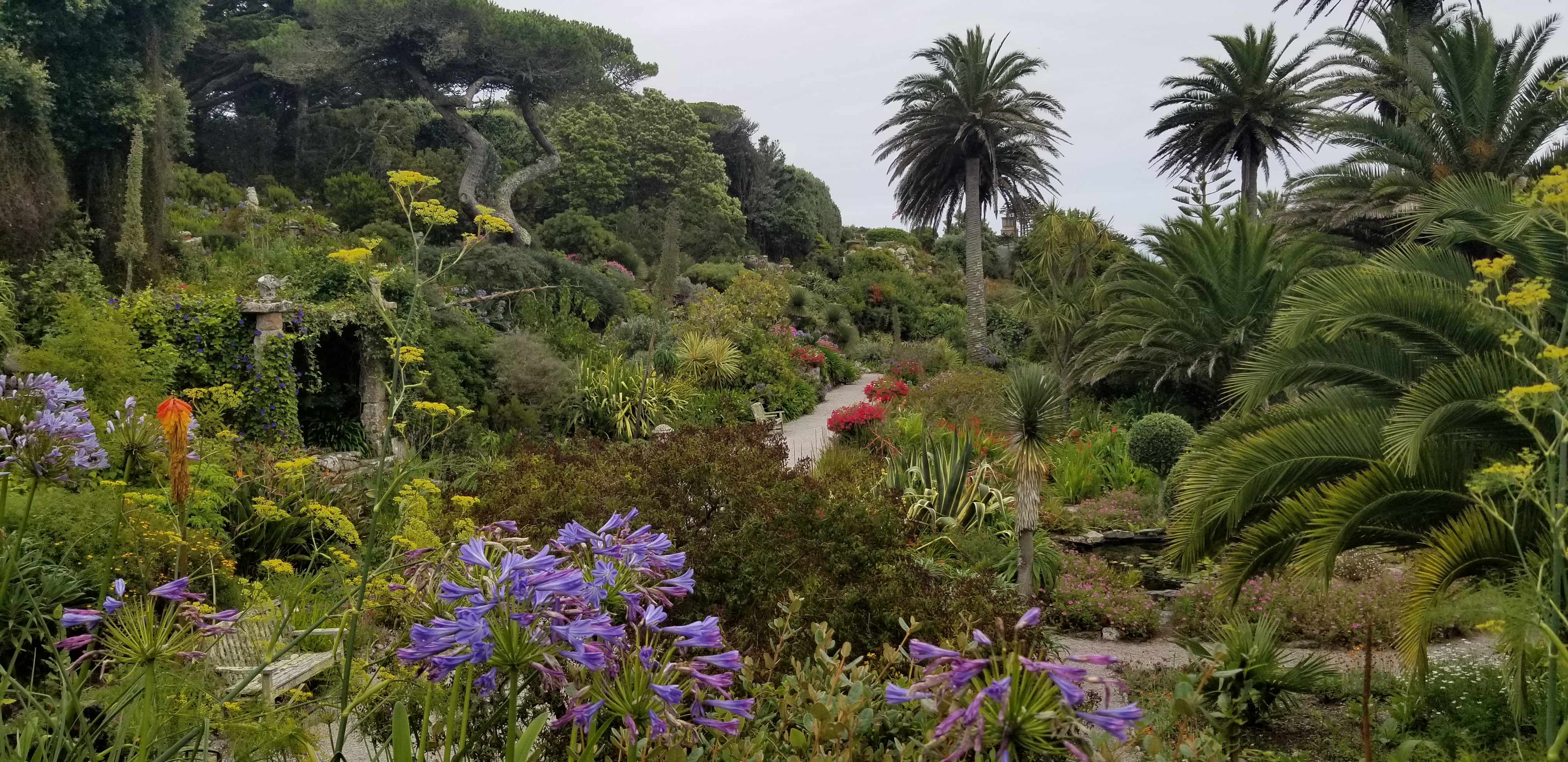 L’île de Tresco abrite un extraordinaire jardin où ont été réunies des milliers de plantes venues de la planète, poussant naturellement entre le 30 ème et le 45 ème parallèle dans les 2 hémisphères. Une patience infinie a permis à des jardiniers inspirés de les re installer dans un jardin au milieu du golf stream et de la lumière du 50 ème parallèle nord. Des allées serpentent d’un banc à un autre, des escaliers de pierre parfois à peine visible au milieu des agapanthes, du fenouil et de géraniums aux proportions de buissons. Les lys sont gigantesques.
