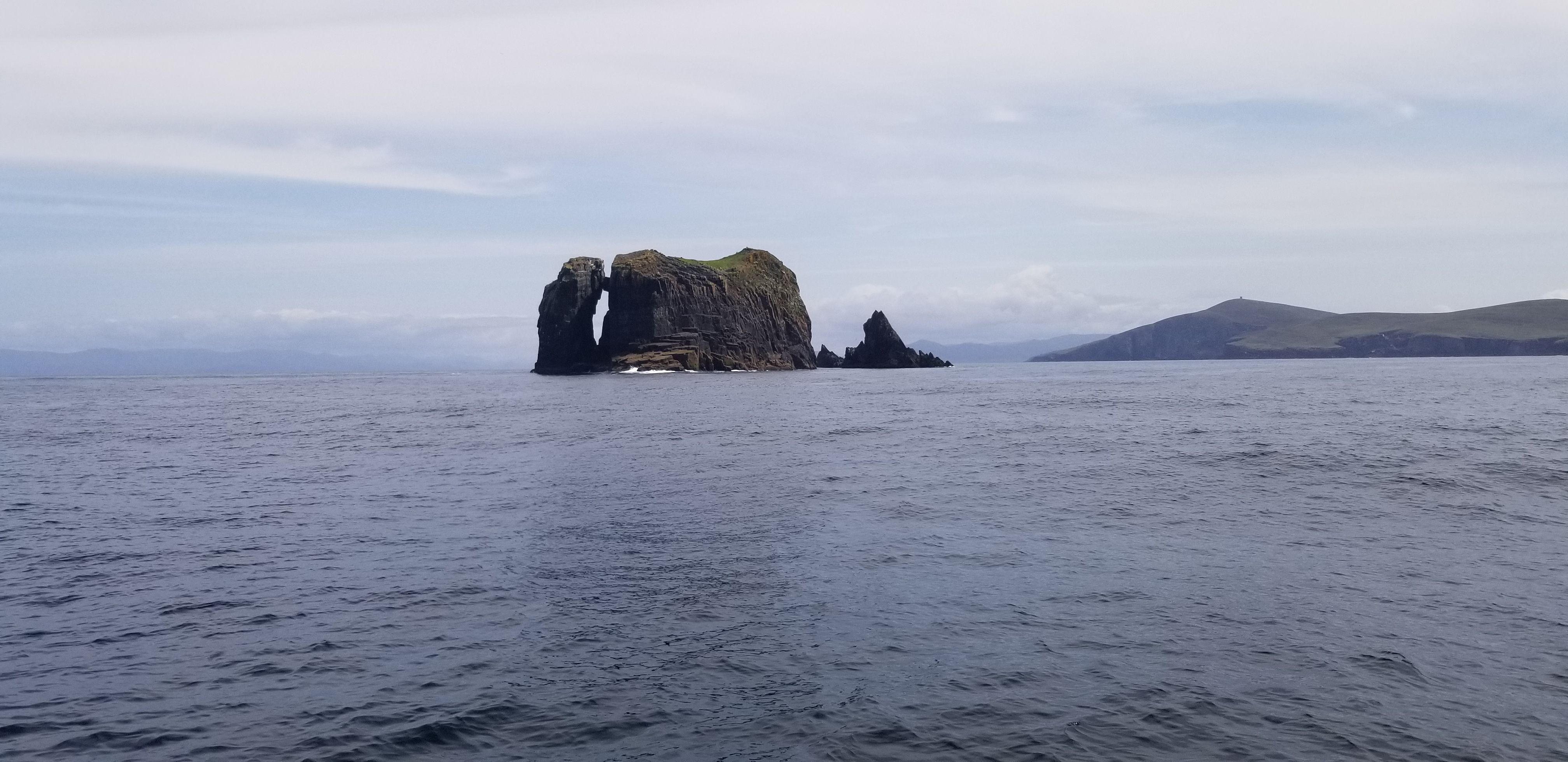 Enfin la fenêtre attendue ! pas de demi-mesure cependant, le vent est passé de trop fort et venant du Nord à rien du tout. Calme plat pour lever l’ancre et rejoindre dans la lumière du matin la baie de Bantry, cap sur les pointes de roc là-bas dans le bleu. Des dauphins, des puffins des anglais, et même un rorqual, des escadrilles de fous de Bassan accompagnent la progression du bateau sur quelques 30 miles vers l’embouchure.