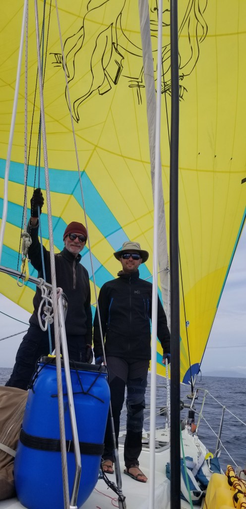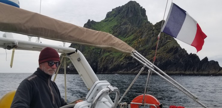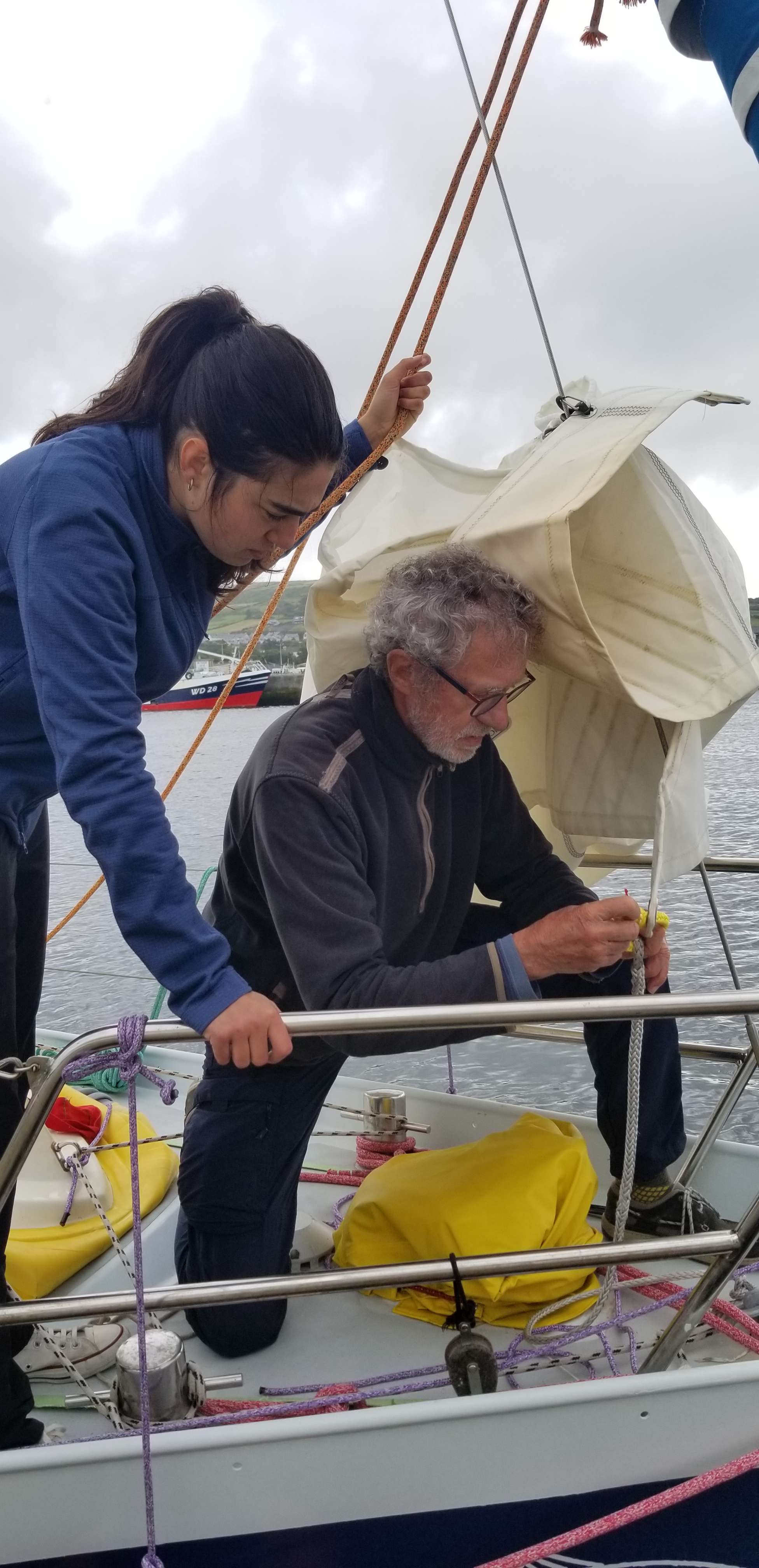 Lever du jour au large de Mizen Head et du Fasnet, puis baisse du vent, l’idée a alors été de lancer le spi. Mais un autre voilier se dirigeait vers le sud, il a fallu empanner pour éviter la colision . Et c’est là que ce spi décidément capricieux s’est enroulé en cocotte sur son étais et celui du génois. Des manœuvres par vent arrière en utilisant la grand voile pour créer des turbulences ont permis de libérer la voile, mais toujours du mauvais côté. L’autre voilier est parti sans demander son reste. Une deuxième tentative d’empanner sous spi s’est de nouveau soldée par une cocotte à 2 tours sur les 2 étais, et d’autres voiliers qui passent sans piper. D’où on déduit qu’il vaut mieux enrouler le spi pour empanner à l’avenir. Cependant, au gré des tentatives pour le démêler, la voile s’est finalement trouvée sur le bon bord. Entretemps le vent avait monté, si bien que Manu et Damien ont eu droit à quelques heures sportives à barrer un spi dynamique par vingt nœuds dans une mer Celtique croisée , au milieu de moutons chaotiques . Quand il a fallu empanner de nouveau, il a semblé plus prudent d’affaler le spi et d’établir le yankee pour continuer à bonne allure en tirant des bords un peu plus sereins et passer la nuit à danser avec les moutons.