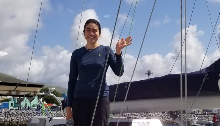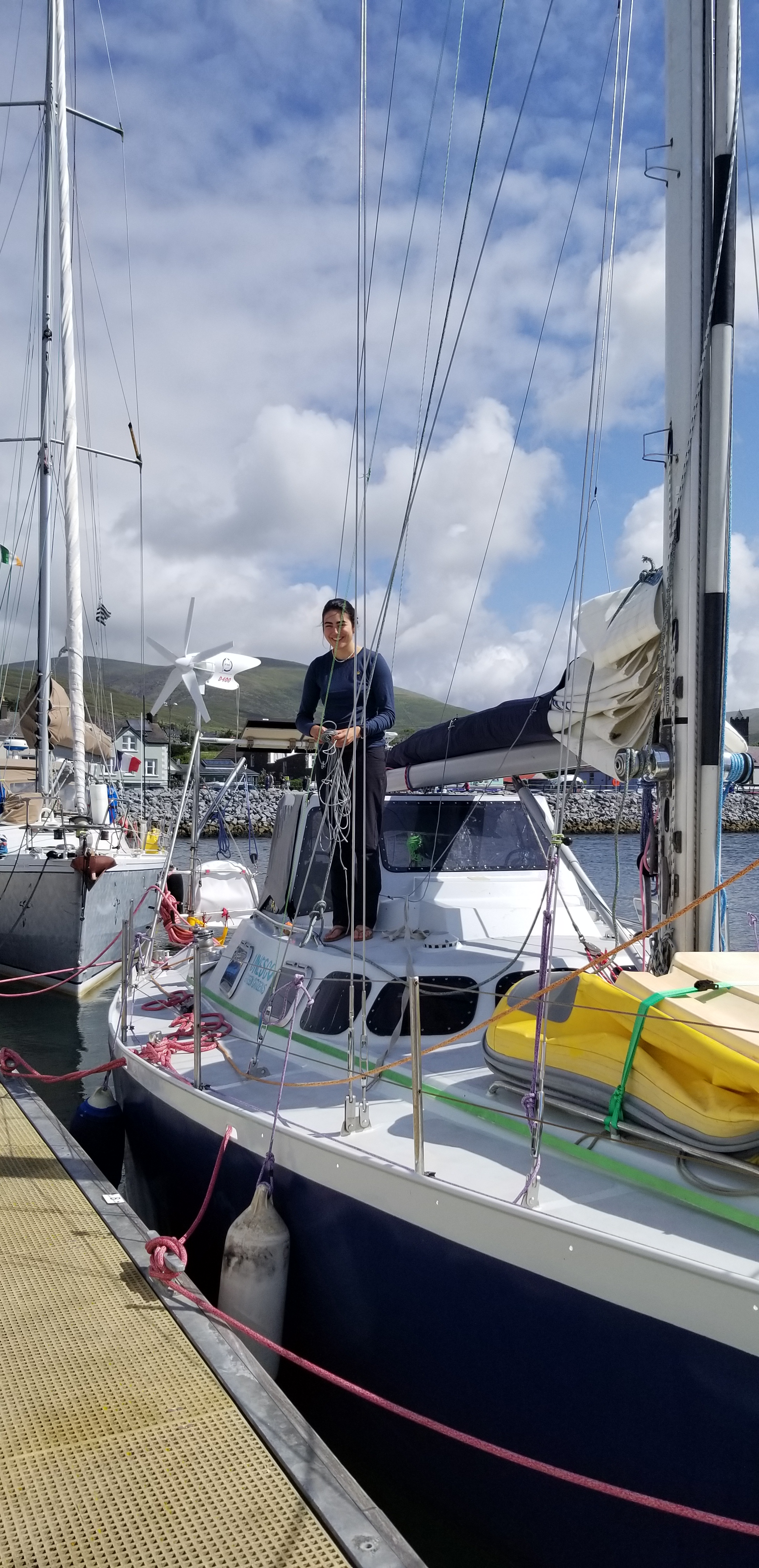 Elle a émergé dans le port de Dingle au matin , venant tout droit de Camaret avec son bateau d’acier préparé à Lorient. En short et veste de quart sous la pluie battante et les bourrasques, un sourire jusqu’aux oreilles, bien contente d’être arrivée aux abris avant la nouvelle dépression. Elle a 25 ans, et elle est encore sous adrénaline de n’avoir pas fermé l’oeil de la nuit. Elle est partie pour une expédition au Groenland, ou elle veut hiverner en solitaire.