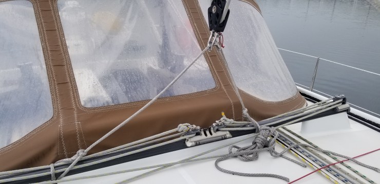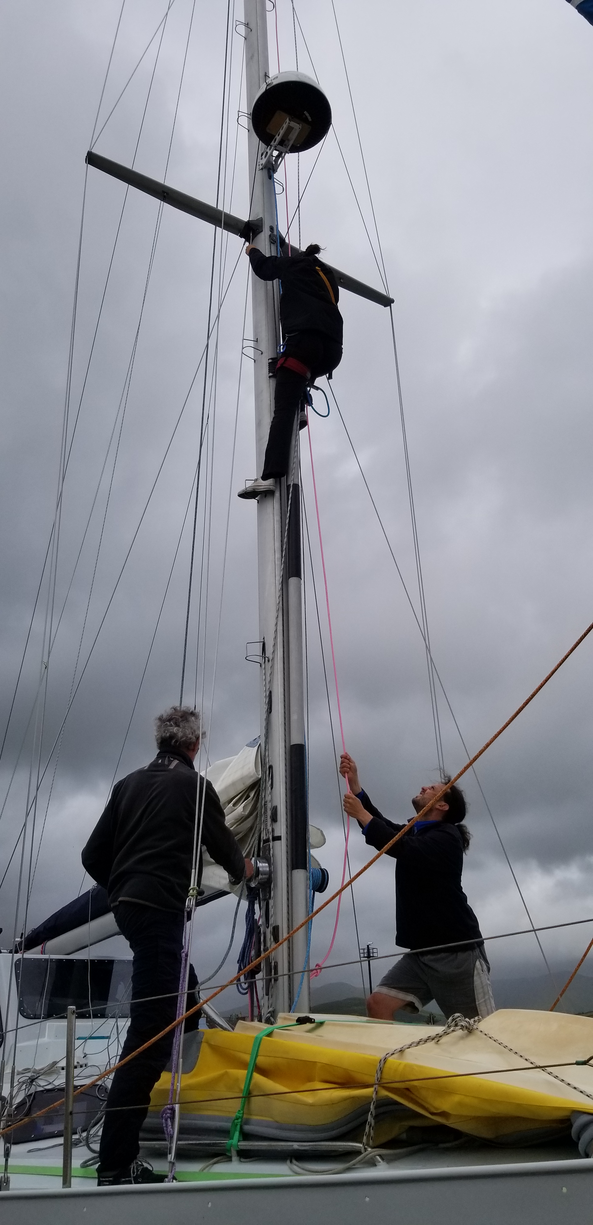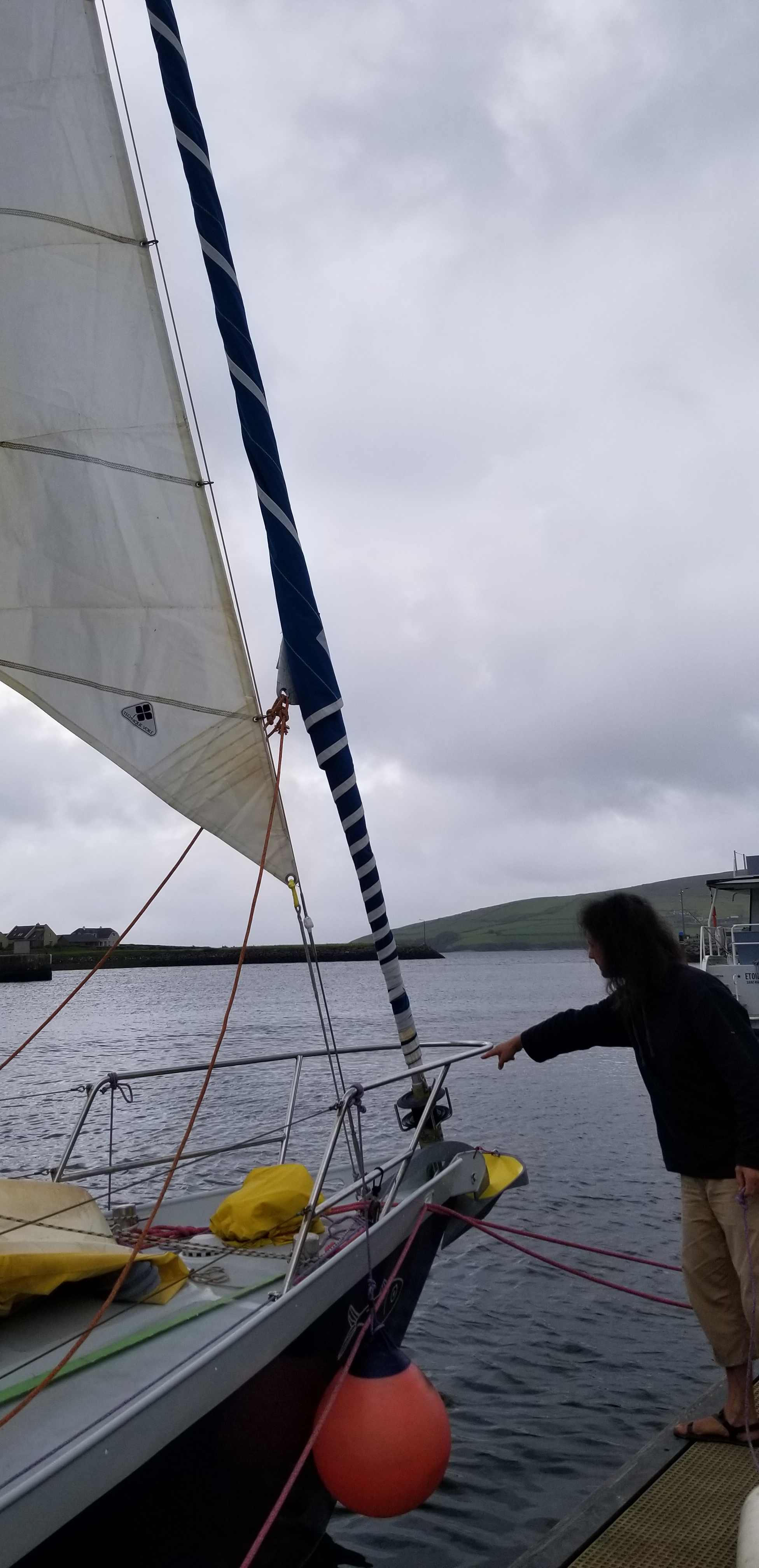 Mais 2 heures après notre départ au près pour regagner les Skellig avant d’atteindre une allure de travers et descendre vers le sud, le chariot du rail de grand voile a brutalement rompu. Il a fallu bricoler une fixation en dynema et retourner à Dingle pour faire un point de la situation en attendant les pièces pour réparer.
