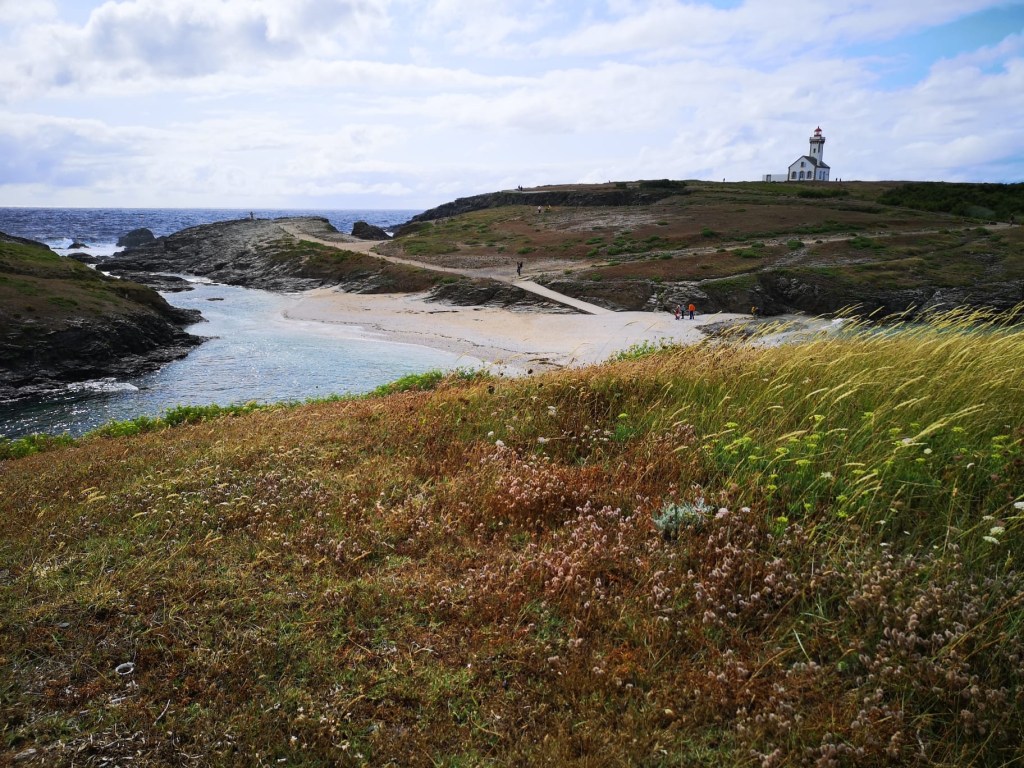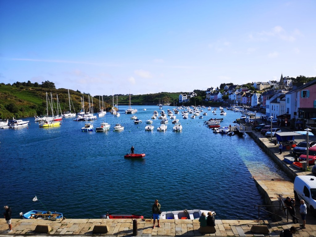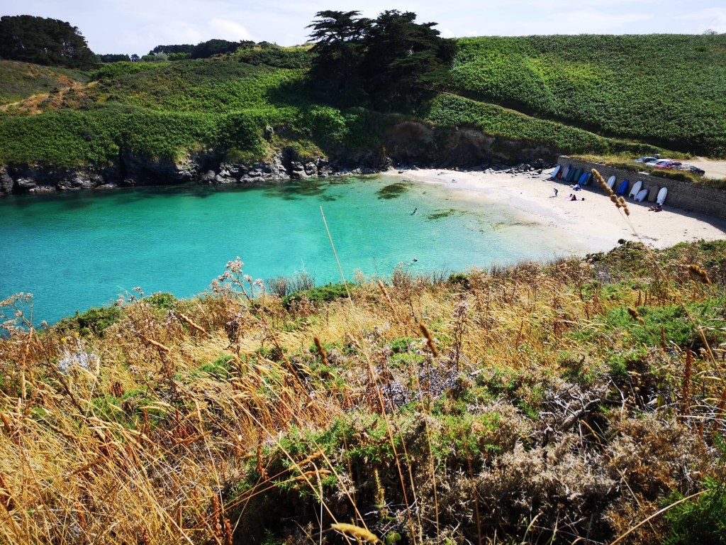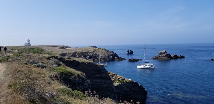 Aux Glenan, la différence avec l’austère Irlande et ses coups de vent était déjà perceptible : des bateaux qui évoluent dans tous les sens, des rires, des enfants sur la plage, du monde et de l’insouciance. A Belle île, cette joyeuse anarchie devient presque cohue, le canal 16 de la VHF occupé en permanence pour toutes sortes d’échanges, le mouillage bondé bien au-delà des capacités d’accueil des bouées offertes aux visiteurs. Mais pour ne pas se sentir trop oppressés par cette affluence soudaine, il reste le sentier côtier vers le phare des Poulains , et les criques d’eau émeraude entre les rochers de schistes, les plages de petits galets blancs.