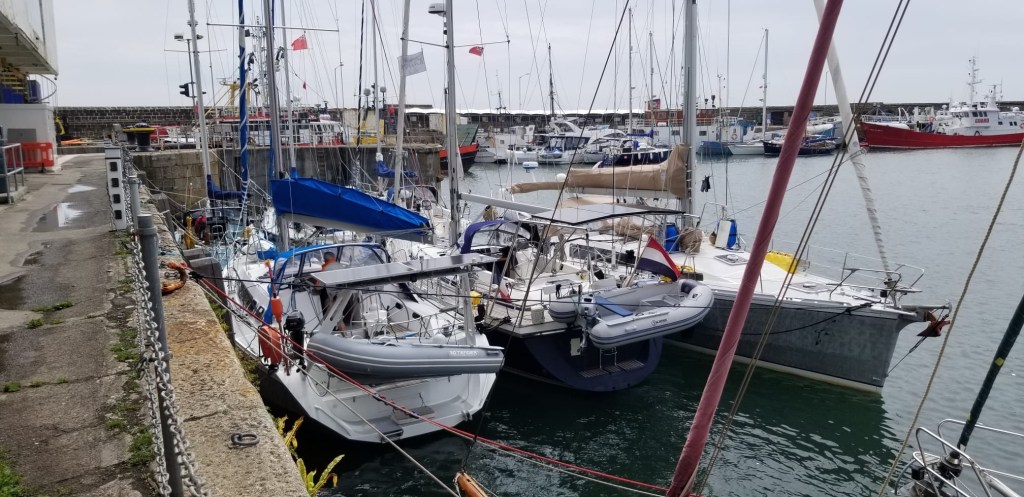 Les plaisanciers bloqués par la météo ont tricoté des amarres entre eux et du dernier vers le quai, y compris les « amarres électriques » pour se préparer au coup de vent de ce soir. Une éclaircie de quelques heures avant un déluge prévu dans la soirée est l’occasion saisie pour faire sécher un peu de linge lavé ce matin