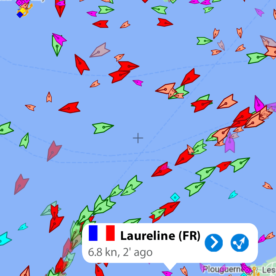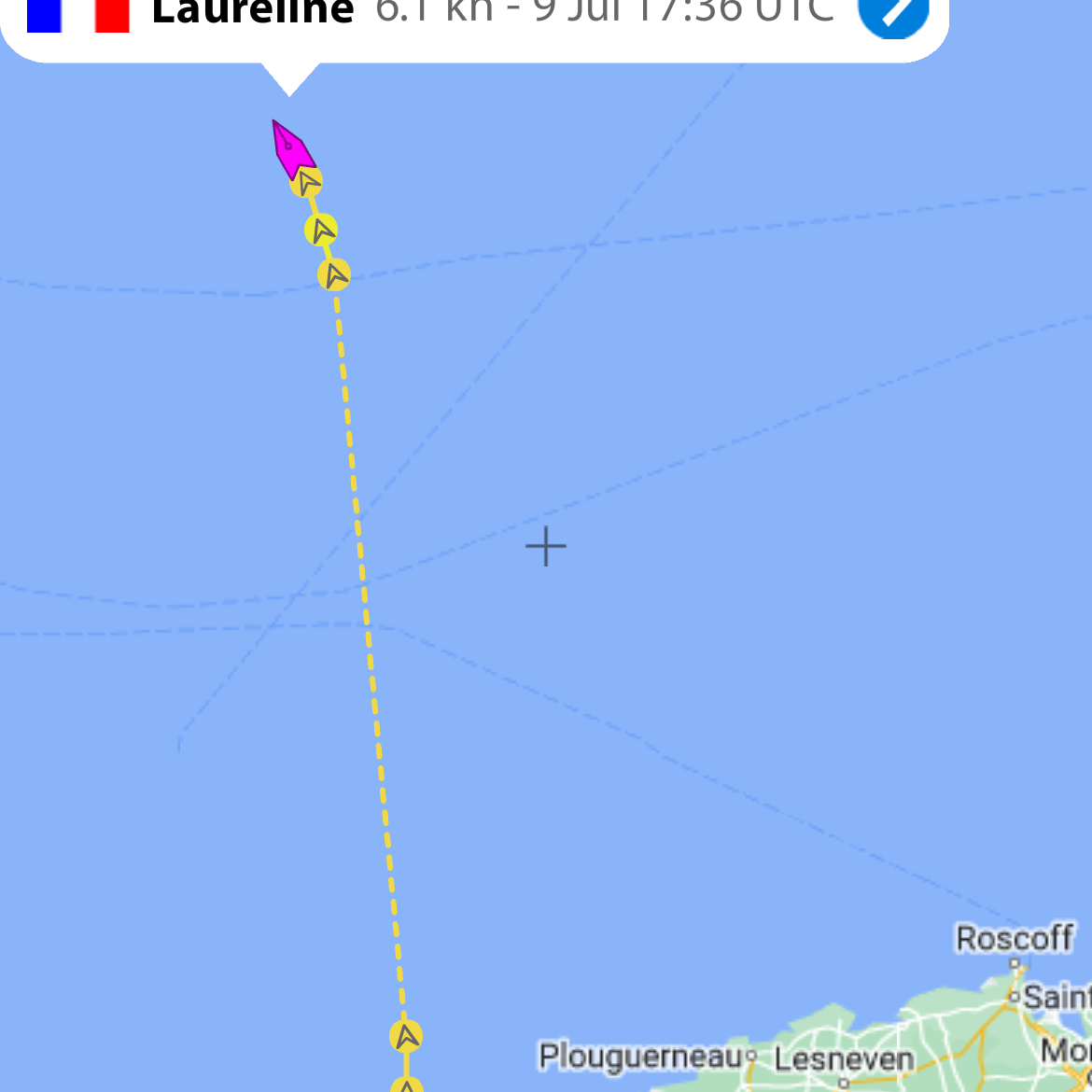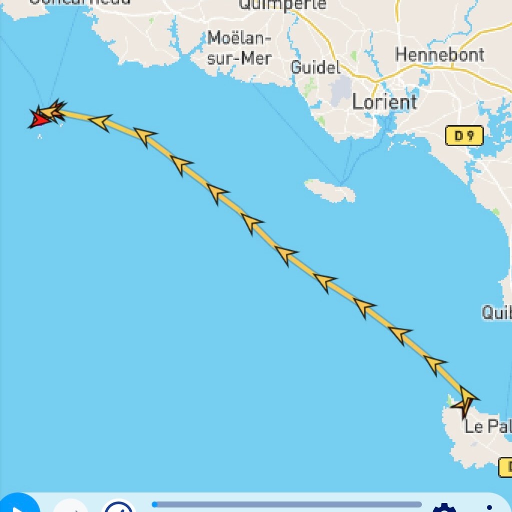 Au petit matin le vent s’est levé enfin de nouveau, au niveau du rail de Ouessant. C’est sous GV haute et Yankee qu’ont commencé les croisements complexes avec le trafic dense des cargos, parfois immenses de plus de 300 mètres lancés à 18 noeuds dans le rail montant séparé du rail descendant. l’AIS , ce précieux instrument, permet de connaitre leur vitesse et leur direction une demi heure à l’avance. L’un d’eux a dévié sa route de 5 degrés sans qu’on lui demande, afin de nous laisser poursuivre sans changement notre route. Bref échange par VHF pour remercier…