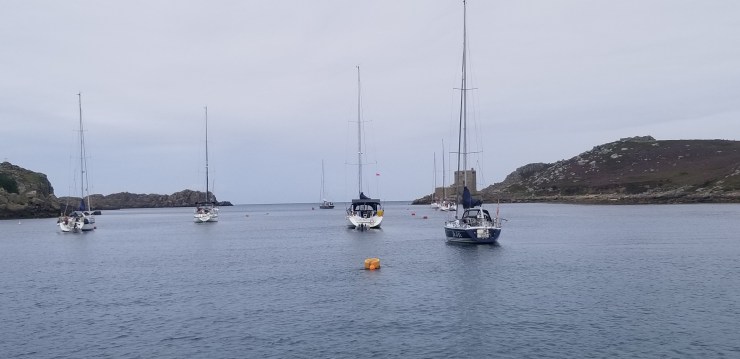 Le vent s’est maintenu jusqu’au petit matin, pour terminer la route par quelques heures au moteur et venir prendre une bouée entre Tresco et Bryer, dans New Grimsby Sound.