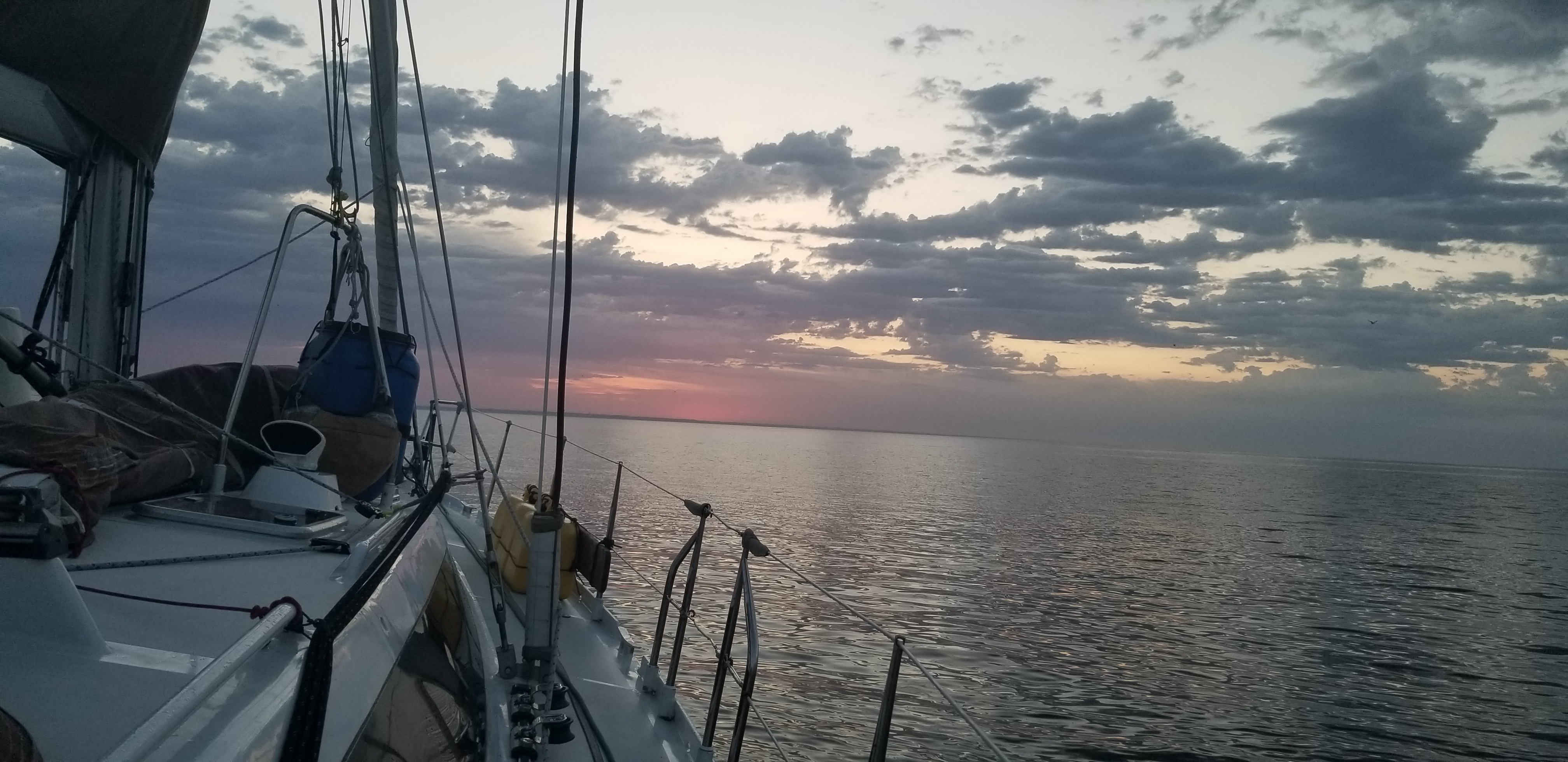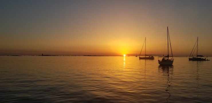 Lever l’ancre avant l’aube, quitter le mouillage à l’heure bleue, en glissant sur la surface lisse de la mer encore endormie , gagner le large quand la lumière vient et que les nuages s’enveloppent d’or , le soleil émerge à l’horizon. Regarder les dauphins qui marsouinent en famille, les oiseaux qui plongent , Partir. Une bouffée de bonheur, même s’il ne s’agit que de rallier Belle Île en Mer au moment où la marée commence à monter, laissant les bateaux à faible tirant d’eau gagner le port l’échouage.