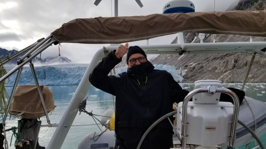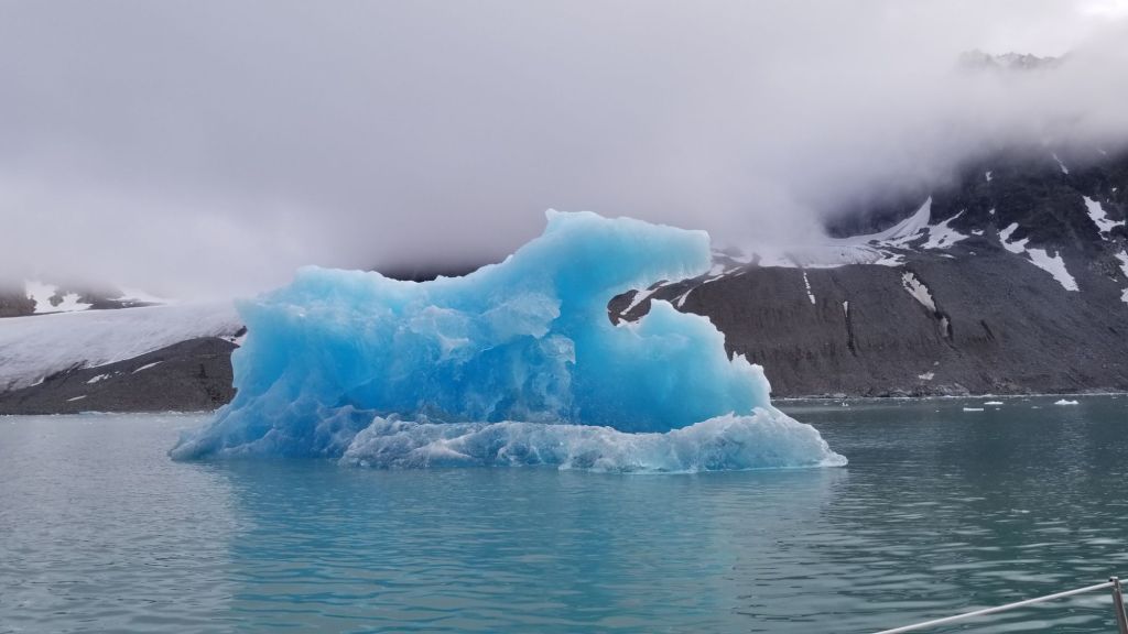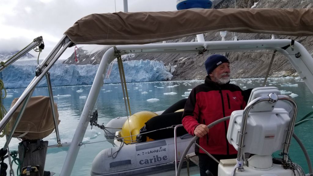 La pression atmosphérique remonte, ce qui signifie surtout que la dépression se déplace. La zone de vents se rapproche qui impose de décamper le soir même, pour éviter d’être bloqués là pendant plusieurs jours. En route donc vers le nord, en passant derrière l’île Amsterdam, base des baleiniers hollandais, tout en évitant les glaces bleues qui dérivent, puis vers l’Est, au portant, pour rejoindre le Woodfjorden ou débouche le célèbre glacier Monacobreen : les prévisions météo y prévoient un temps calme pour les jours qui viennent.