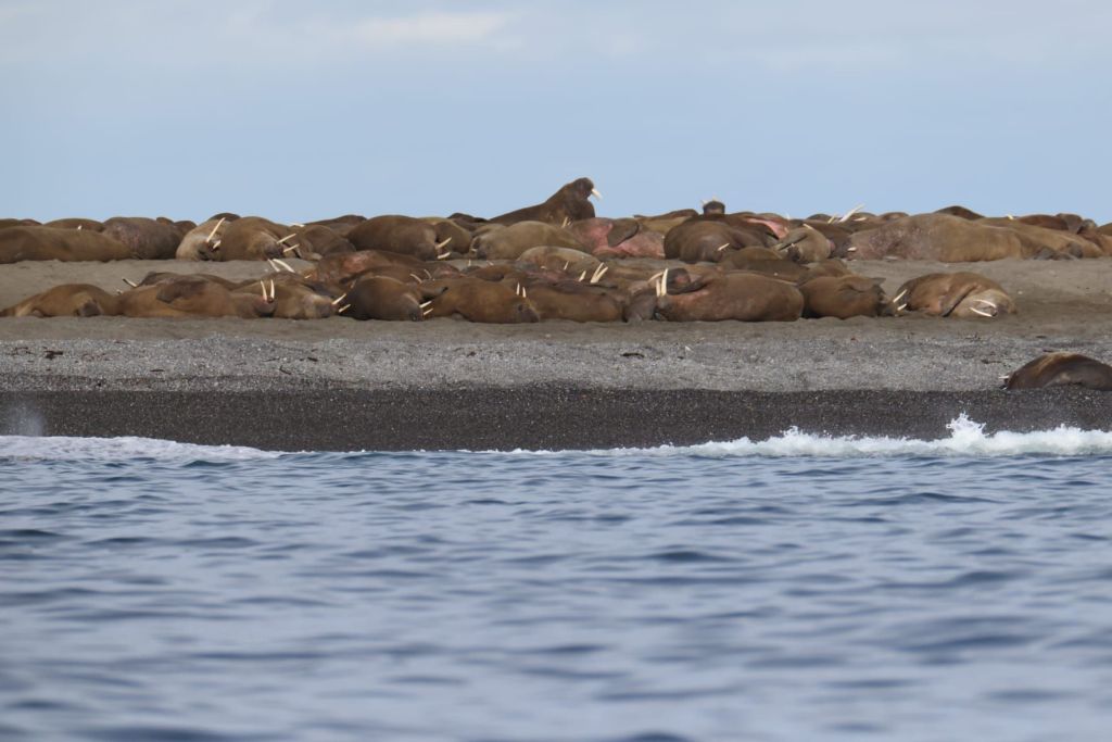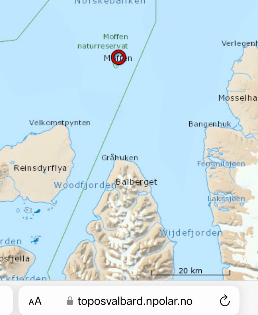 Ce matin, lever à 5 heures, petit déjeuner en route vers l’île Moften, réserve naturelle ou il est interdit de pénétrer en deçà d’une limite de 300 mètres du rivage en été, pour laisser tranquilles les oiseaux de mer qui y font leurs nids à l’écart des renards et des ours. Une colonie de morses y a aussi trouvé refuge au pied de la balise sud de l’île, pyramide de bois flottés peinte en rouge vermillon.