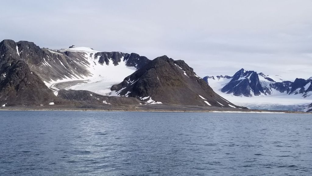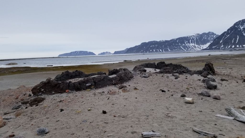 Quelques miles au sud se trouve Smeerenburg, sur l’île Amsterdamoya. C’était la base des baleiniers Hollandais, au XVIIeme siecle : une moraine avance sur les eaux libres, prolongée par une plage en pente douce aujourd’hui signalée par une balise pyramidale rouge vif. Au pied d’une montagne brune, des creux dans la moraine retiennent des eaux de fontes de glaciers, indispensables ressources d’eau douce pour la « ville », très appréciée aujourd’hui par les oiseaux qui viennent y boire.