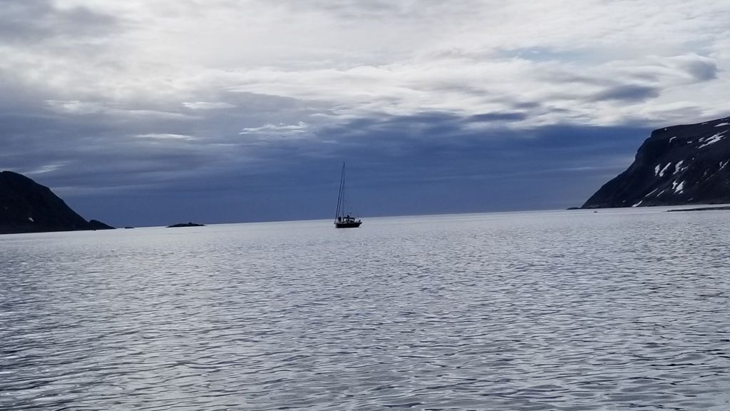 Depuis Moften, le cheminement du bateau est passé par les îlots du nord ouest, montagnes pointues, noires veinées de blanc pur, entrecoupées de glaciers vélant dans l’eau du cristal turquoise. Au milieu de cette improbable géographie, une zone de calme que les baleiniers hollandais ont baptisée Fair Haven. C’est là qu’en juin 2023, le voilier Orionde a été arrêté par la banquise.