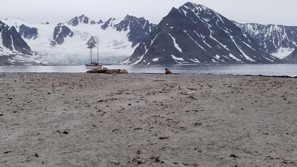 L’ancre a été jetée devant la moraine, et le dinghy descendu pour rejoindre la plage ou a été batie cette ville, et son cimetière. La vie y a aujourd’hui repris ses droits : un groupe de morses serrés les uns contre les autres, un troupeau de bernaches nonettes avec leurs poussins, dans la mer les sternes infatigables virevoltent et pêchent de petites choses qu’elles attrapent en surface, comme des hirondelles capturant des moucherons.