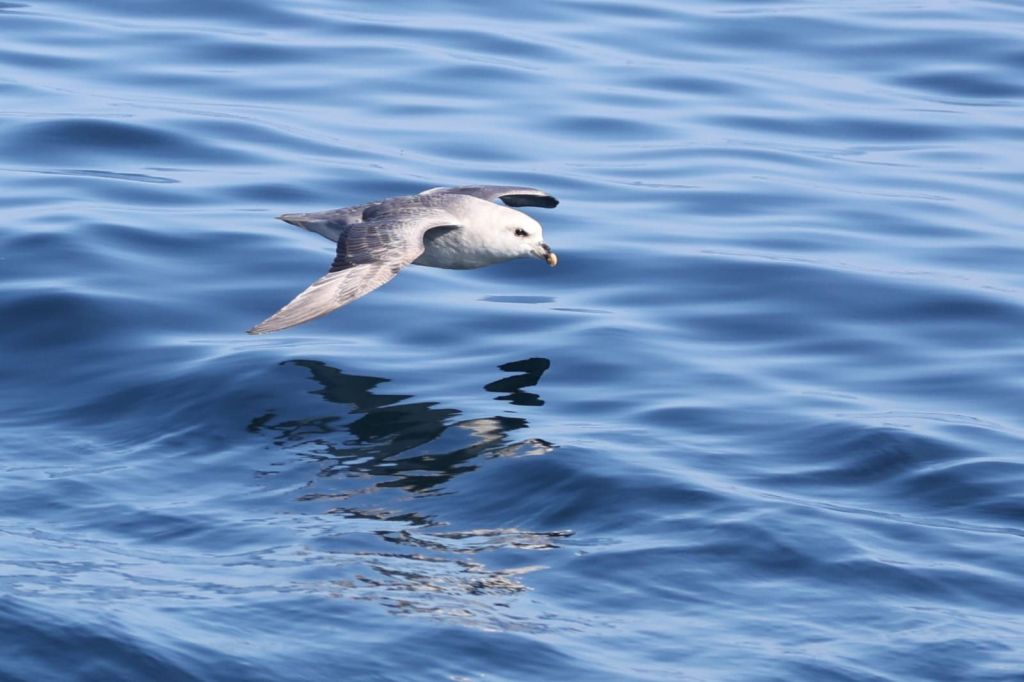 Des fulmars se relaient autour du bateau, semblant jouer au toboggan avec les haubans et la coque, glissant dans les turbulences de la grand voile, puis au ras de l’eau, quelques battements d’ailes et retour.