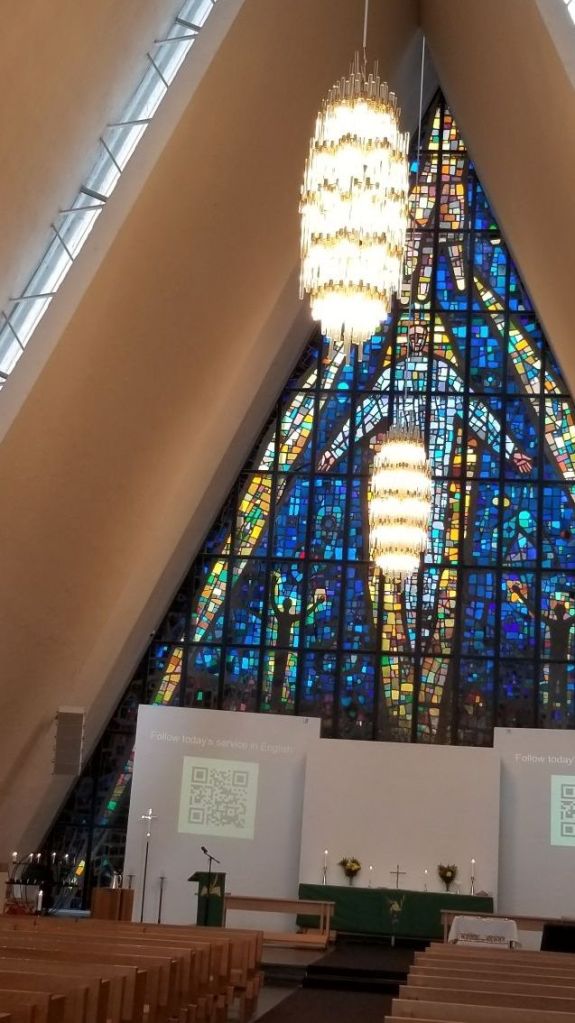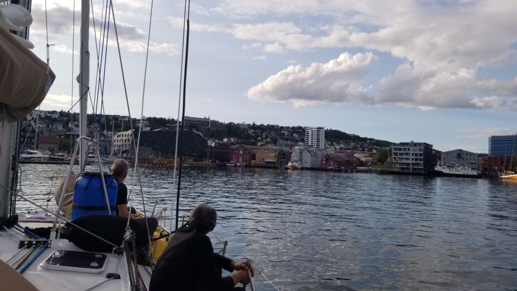 Tromsø marque le retour à la civilisation. Ville universitaire animée, fréquentée par de nombreux touristes venus en bateaux de croisière ou en petits équipages de voiliers . C’est un bon point de rendez-vous pour renouveler les équipages et faire la transition entre Svalbard au Nord et le continent au Sud. Petits restaurants, bars, la cathédrale des glaces et un petit musée de la vie dans le grand Nord, des trappeurs aux explorateurs des pôles partis de cette ville : Nansen et Johansen fin XIX, Amundsen début XXeme, qui ont jalonné l’arctique, repéré le pôle Nord et permis à la Norvège de revendiquer en 1920 la propriété du Svalbard et y reguler la chasse aux rennes, presque disparus en 1925, aux baleines, phoques et ours blancs. Amundsen est aussi celui qui a gagné le premier le pôle Sud en 1911.