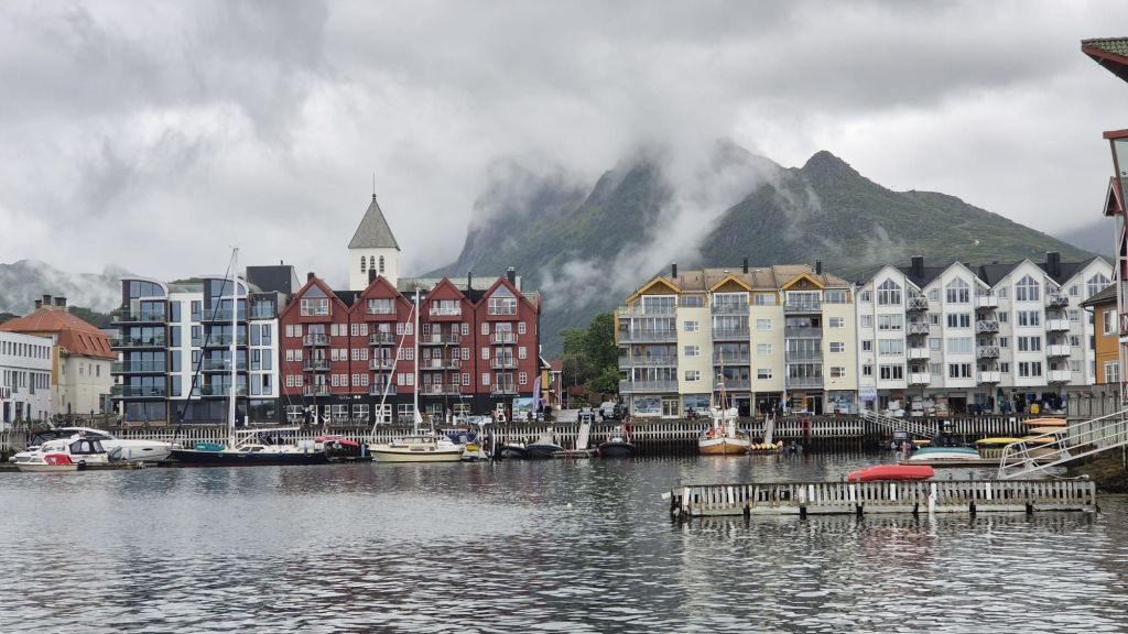 A cette latitude pourtant encore au nord du cercle polaire , le soleil hésite déjà à passer sous l’horizon. Le Trollfjord et ses à pics de 1200 m abritent des aigles noirs. Les paysages à chaque embranchement invitent à une pause admirative.  Par 68° Nord, 14° Est, Svolvaer est une ancienne ville baleinière située dans les Lofoten. Un peu plus au sud, Nusfjord est un village de pêcheurs, construit haut sur ses pilotis. Du poisson à vendre?