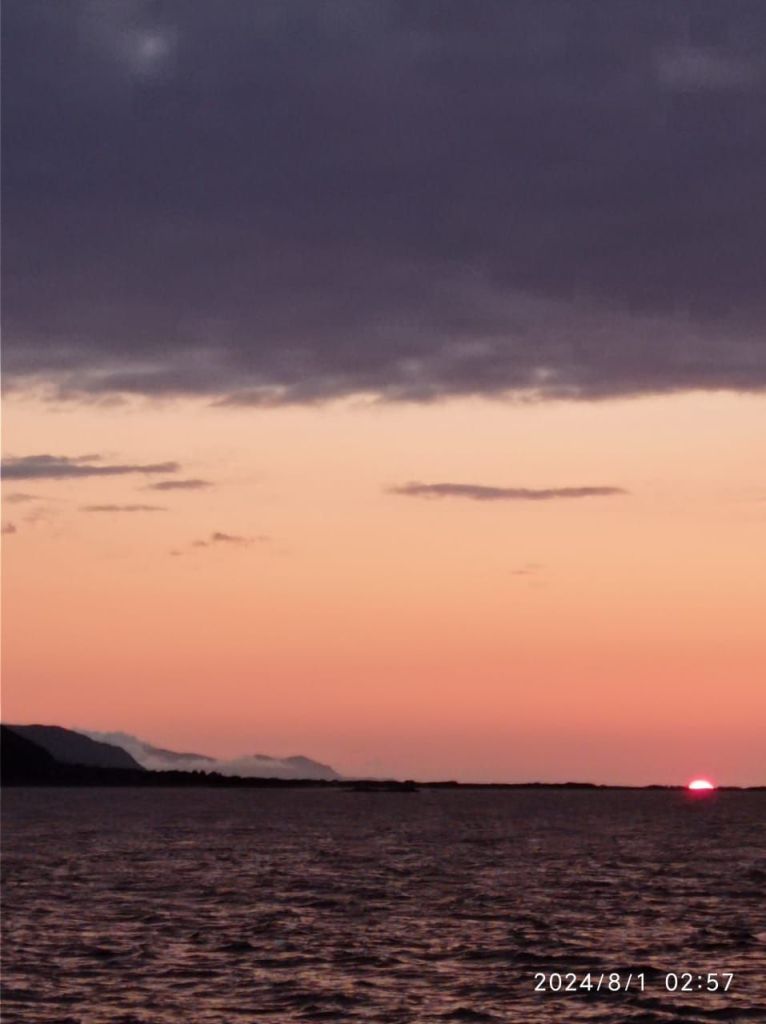 Position le 3 août 2024: 65°05’N 9°21’E, cap 255°