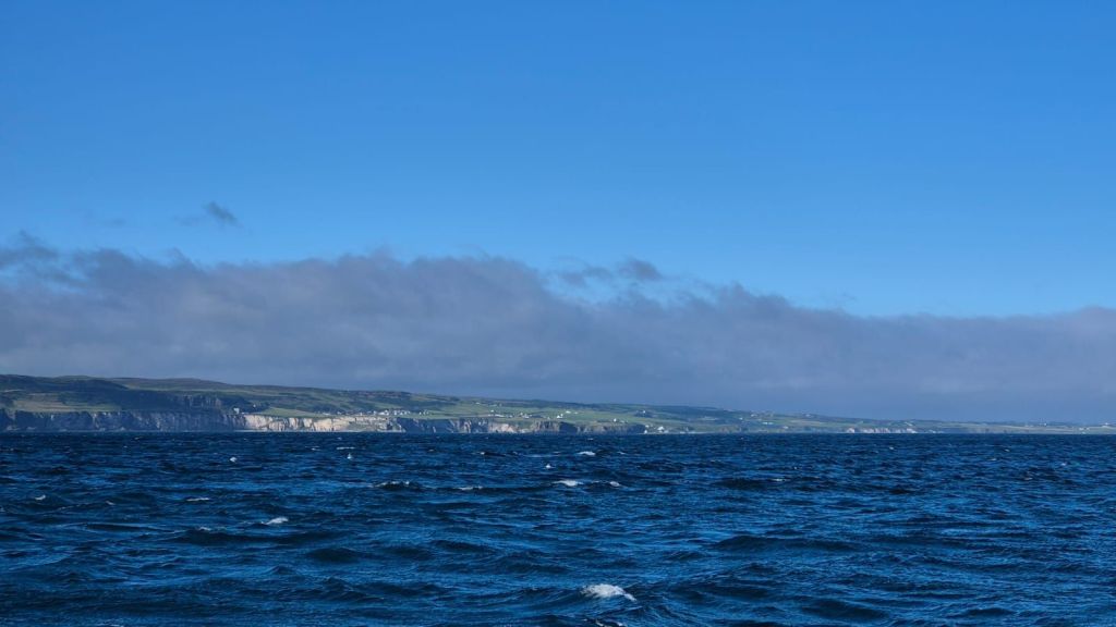 L’apparition de plages lumineuses dans le ciel nuageux de Rathlin , au Nord de l’Irlande, la remontée du baromètre et les rafales elles-mêmes sont la triade signature de l’arrivée imminente du front froid, annonce de la rotation du vent à l’ouest. Dans cette perspective, il a été jugé préférable de ne pas s’arrêter à Port Ellen, ou la Laureline se serait trouvée piégée par la violence du vent qui s’annonce en fanfare. Traversée donc vers Rathlin, dont la Laureline a fait le tour, avant une nouvelle traversée vers l’Ecosse, toujours en exploitant le vent de sud, pour rattraper dans le North Passage la belle dorsale qui devrait la propulser tambour battant vers le sud dans la mer d’Irlande
