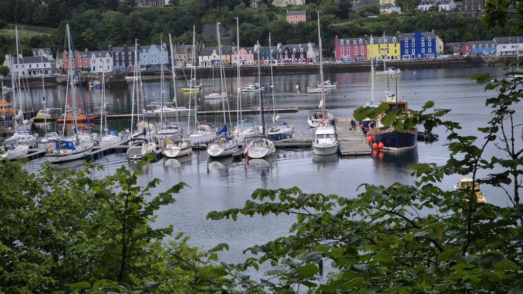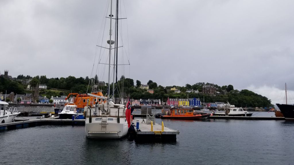 Une dépression centrée sur l’Islande fait glisser sur l’Ecosse un souffle bien frais chargé de pluie. Ciel gris, averses, et vent froid incitent à abandonner le mouillage sauvage et chercher refuge sur un ponton sympa, d’autant que dimanche s’annonce encore pire. Tobermory est sans doute le port le mieux situé dans le coin, des places de pontons et un poste d’accueil ont été récemment ouverts.
