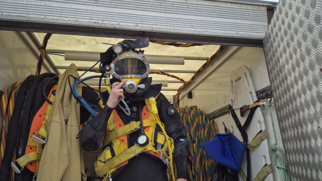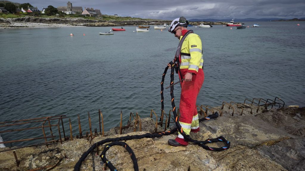 La navette transite tous les 1/4 d’heures entre Mull et Iona, des travaux sont engagés sur la rampe du bateau pour l’agrandir. Au bout du narguilé que tient cet ouvrier dans la main, un plongeur en scaphandre ajuste à marée haute un coffrage avant la prochaine coulée de beton.