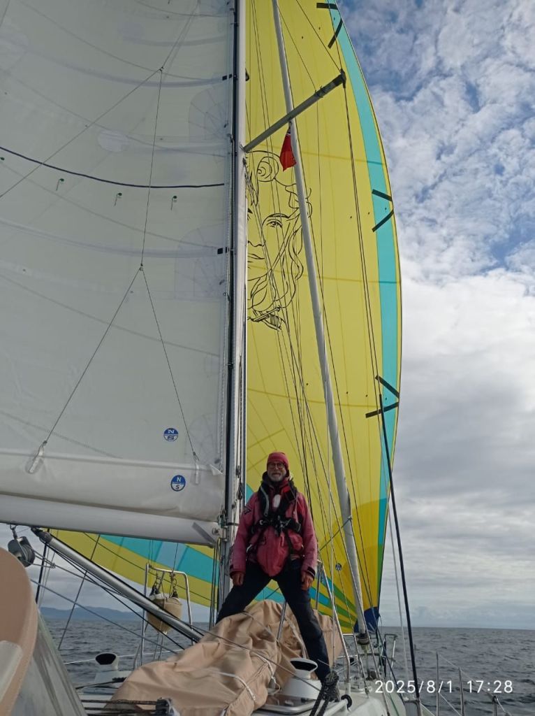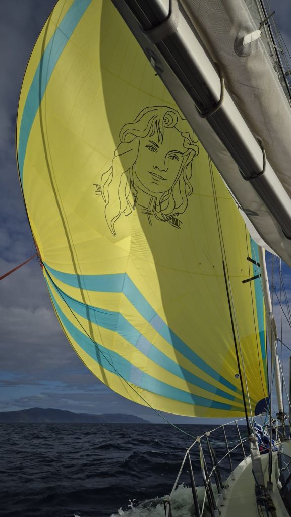 Vent au portant mais le courant contre en arrivant au Mull of Kintyre, l’occasion de sortir le spi, dont le pilote automatique s’accommodait très bien jusqu’à devoir affaler la voile à l’approche de la pointe, ou le vent est devenu turbulent et la mer agitée sous l’effet d’un robuste courant sortant.