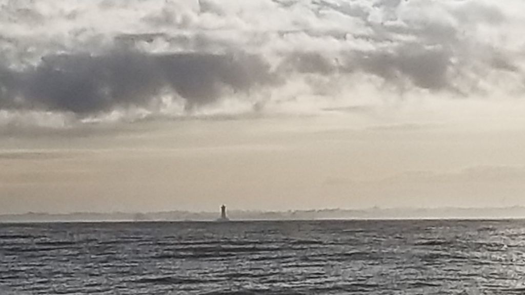 Arrivée devant le phare du Four, à l’heure pour prendre le premier tapis roulant vers le Sud au plus près de la pointe St Mathieu et voilà que se pointent dans la brume les Rochers du Tas de pois.
