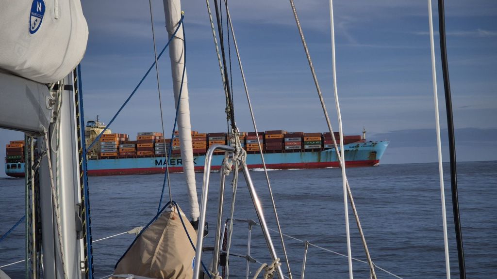 Malgré une nuit fatiguante (voire nauséeuse), l’équipage a saisi l’opportunité de traverser la Manche dans la foulée, avec des conditions de vent et de mer beaucoup plus confortables, au moteur sur une mer d’huile, au milieu d’un traffic intense.