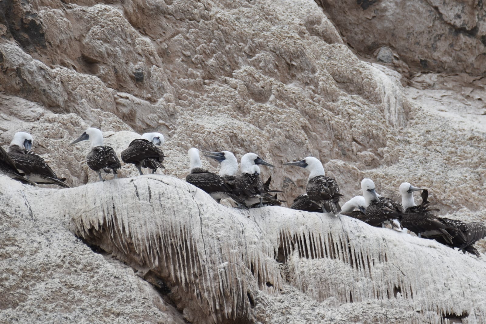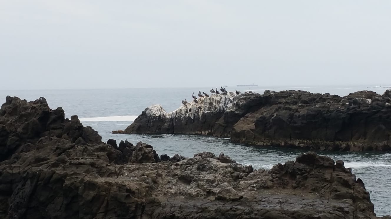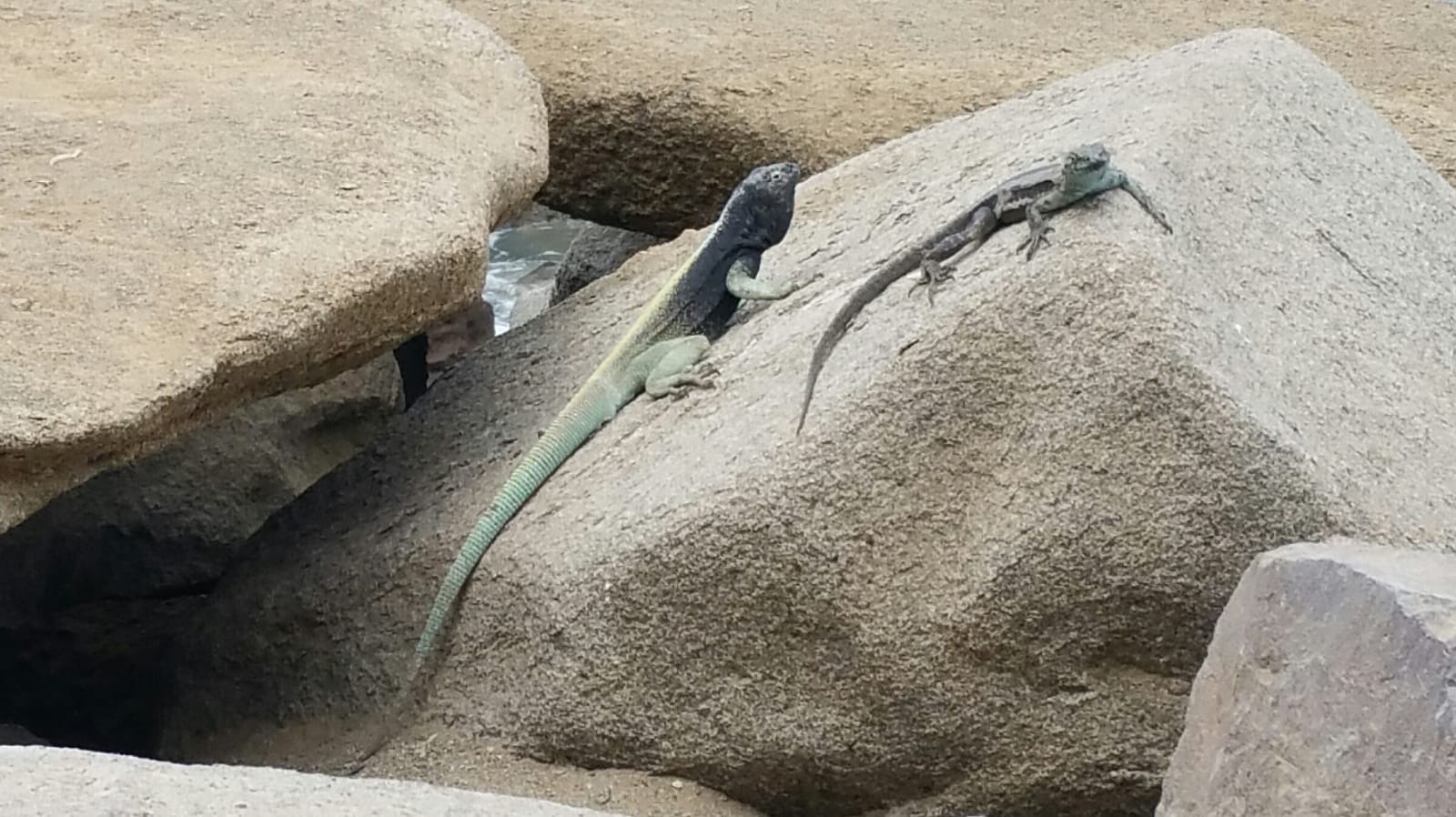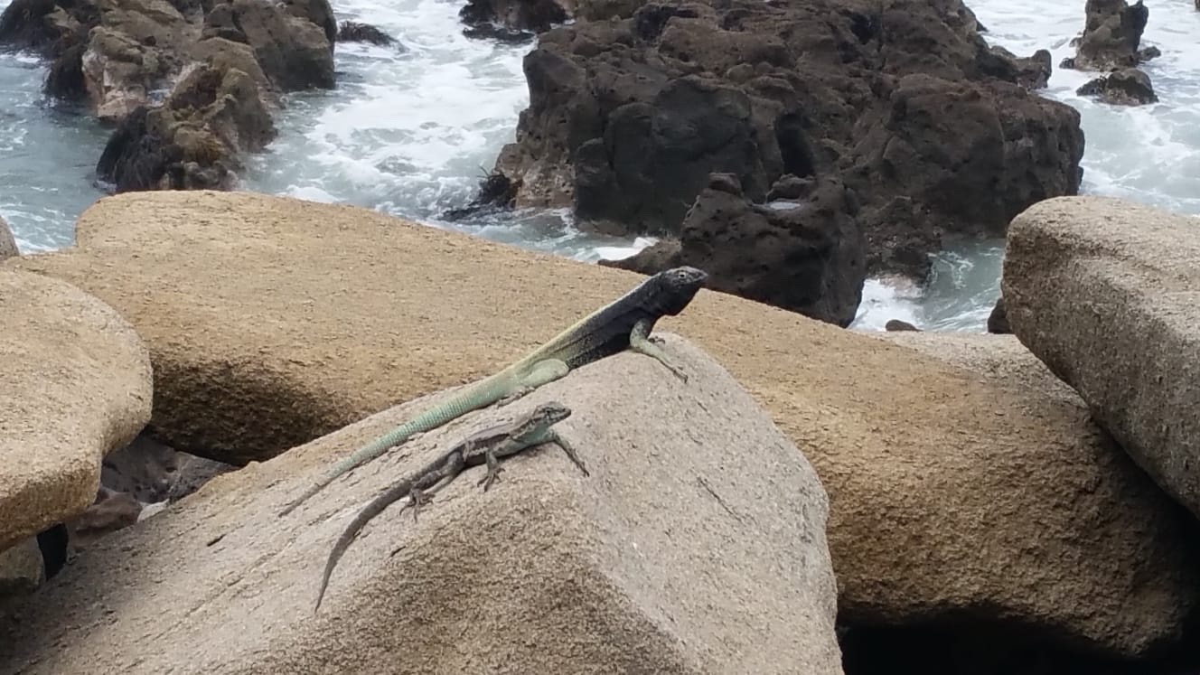 Lézard et iguane au bord de la mer. Ils mangent des insectes où des crevettesEntre rochers battus par les vagues et falaises percées de grottes autrefois habitées par les indiens Chichorros, des roqueries d’oiseaux de mer sont installées à 2 pas de Arica. Ici celle des pélicans. Au dessus de nos têtes celle des piqueros du Pérou, cousins de nos fous de bassan